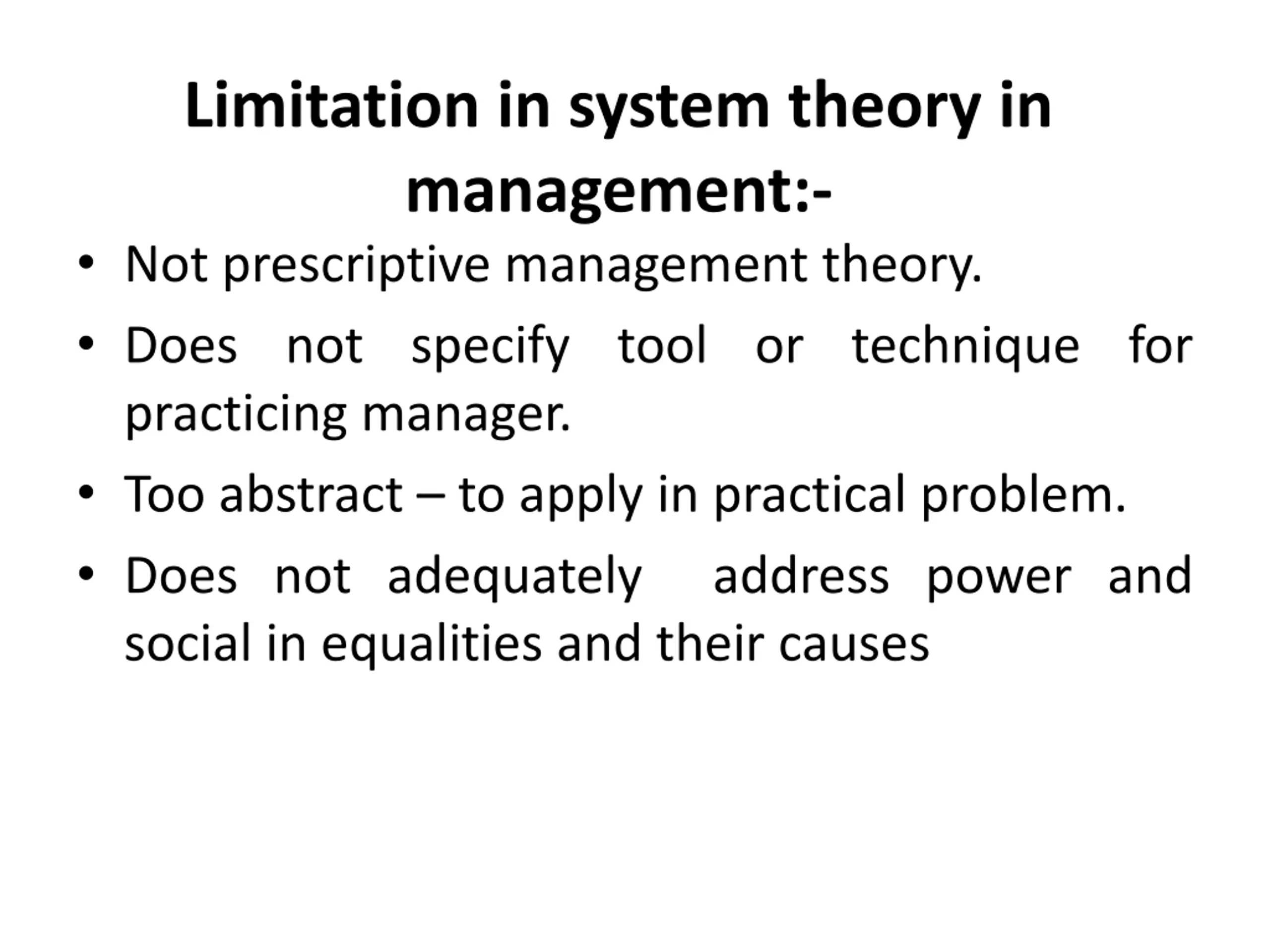 Limitation in system theory in management:- Not prescriptive management theory. Does not specify tool or technique for practicing manager. Too abstract to apply in practical problem. Does not adequately social in equalities and their causes address power and