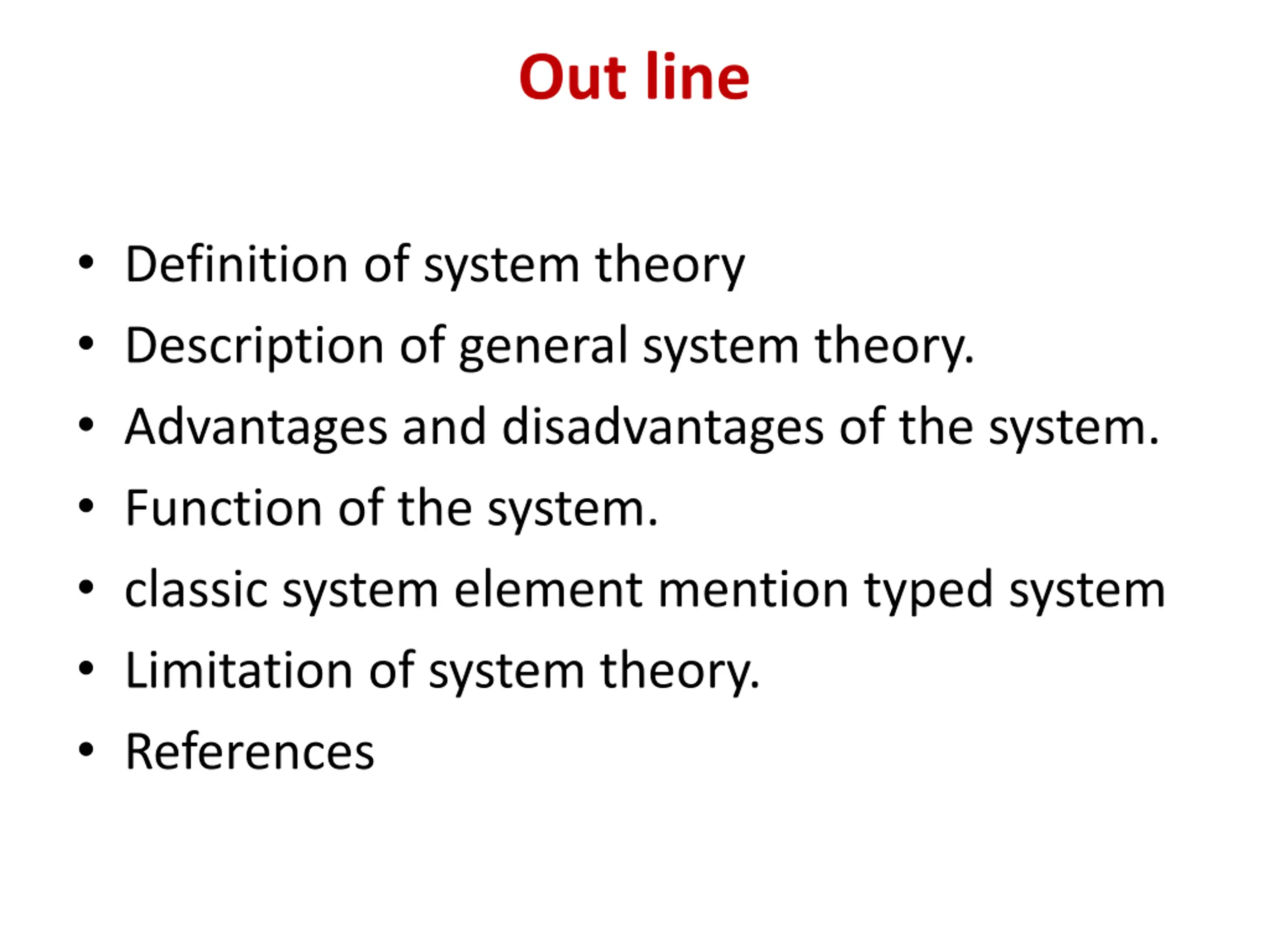 Out line Definition of system theory Description of general system theory. Advantages and disadvantages of the system. Function of the system. classic system element mention typed system Limitation of system theory. References