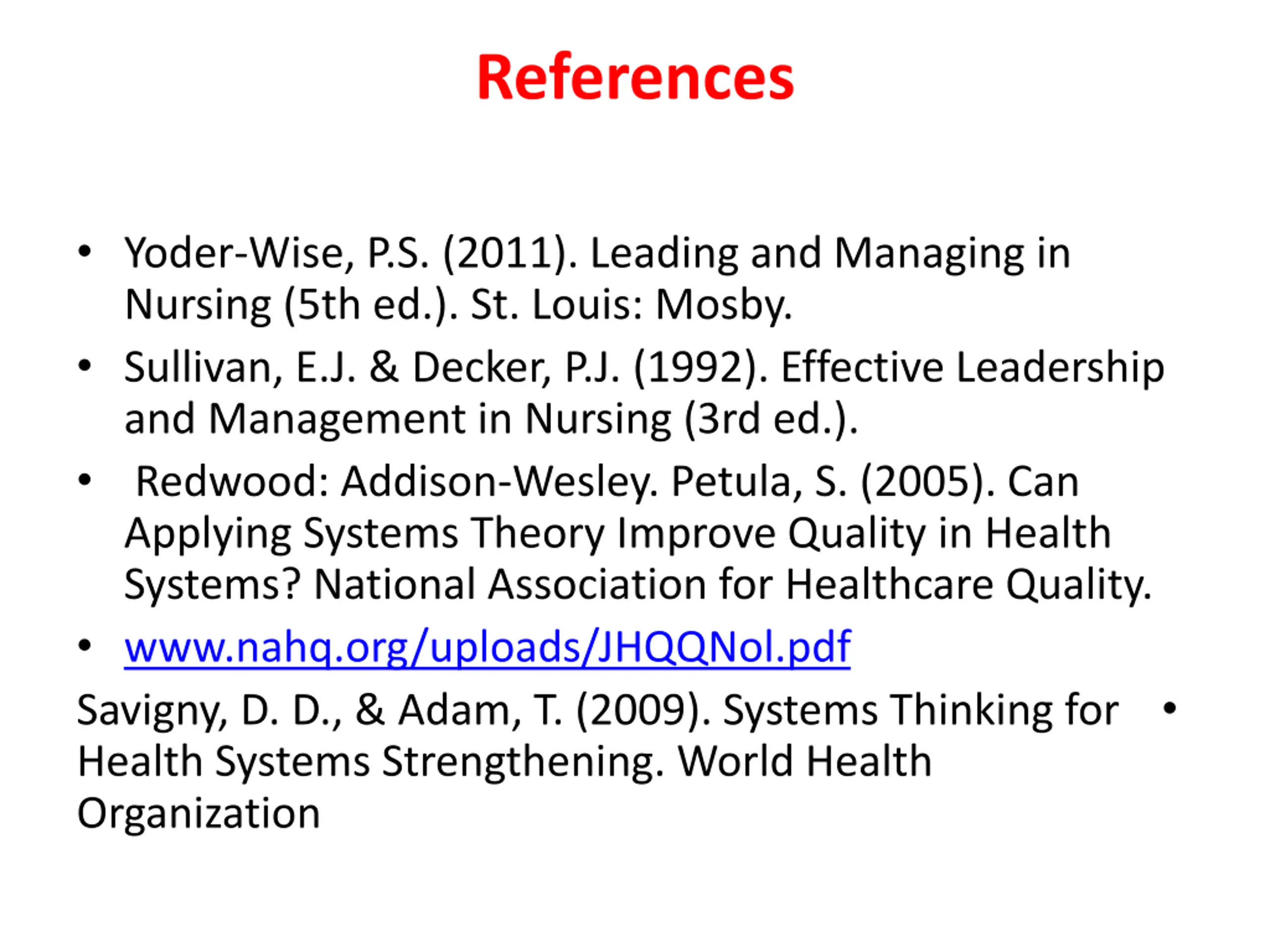 References Yoder-Wise, P.S. (2011). Leading and Managing in Nursing (5th ed.). St. Louis: Mosby. Sullivan, E.J. & Decker, P.J. (1992). Effective Leadership and Management in Nursing (3rd ed.). Redwood: Addison-Wesley. Petula, S. (2005). Can Applying Systems Theory Improve Quality in Health Systems? National Association for Healthcare Quality. www.nahq.org/uploads/JHQQNol.pdf Savigny, D. D., & Adam, T. (2009). Systems Thinking for Health Systems Strengthening. World Health Organization