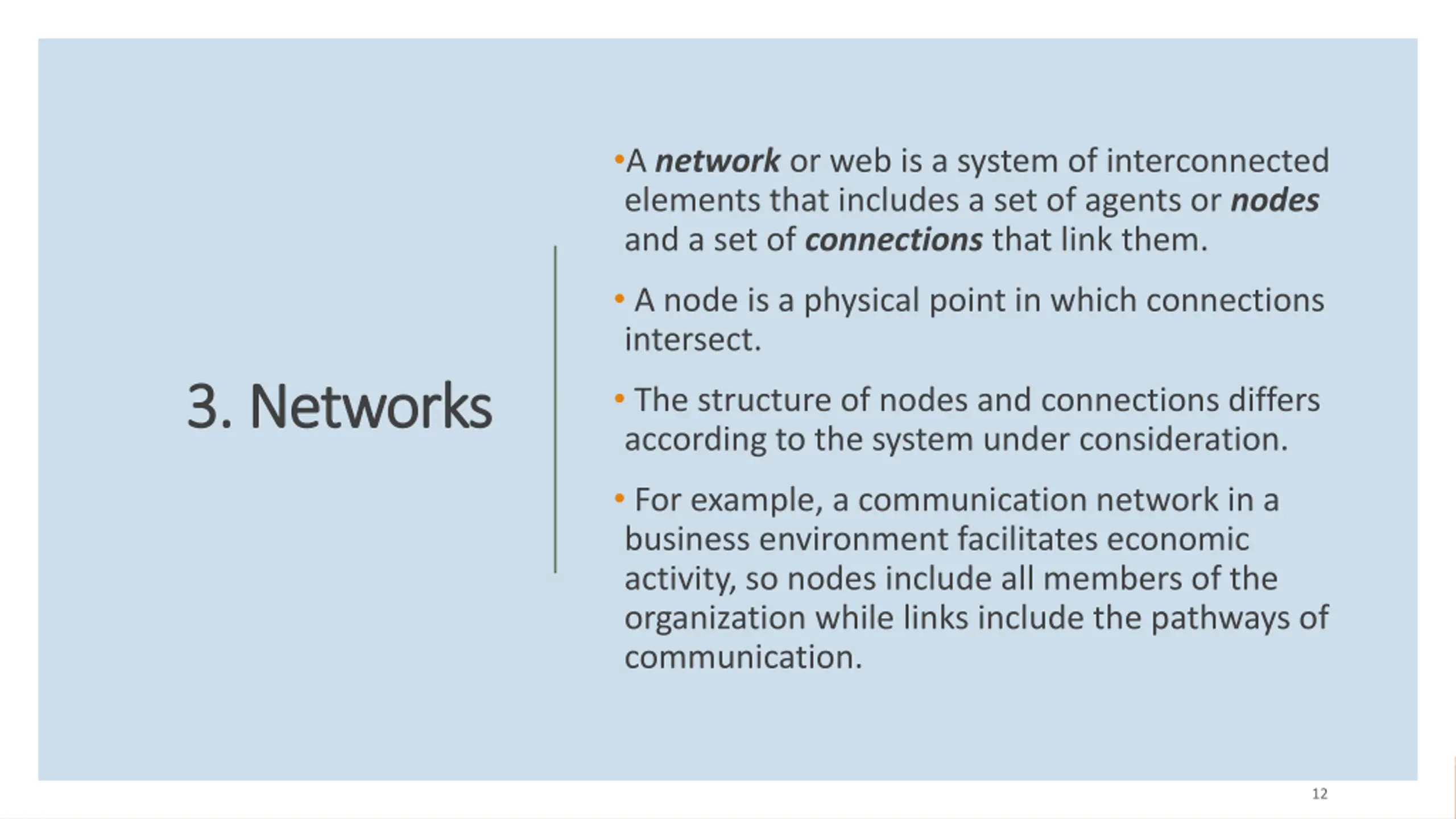 A network or web is a system of interconnected elements that includes a set of agents or nodes and a set of connections that link them. A node is a physical point in which connections intersect. 3. Networks 3. Networks The structure of nodes and connections differs according to the system under consideration. For example, a communication network in a business environment facilitates economic activity, so nodes include all members of the organization while links include the pathways of communication. 12 PANDEMIC ECONOMICS, CHAPTER 3
