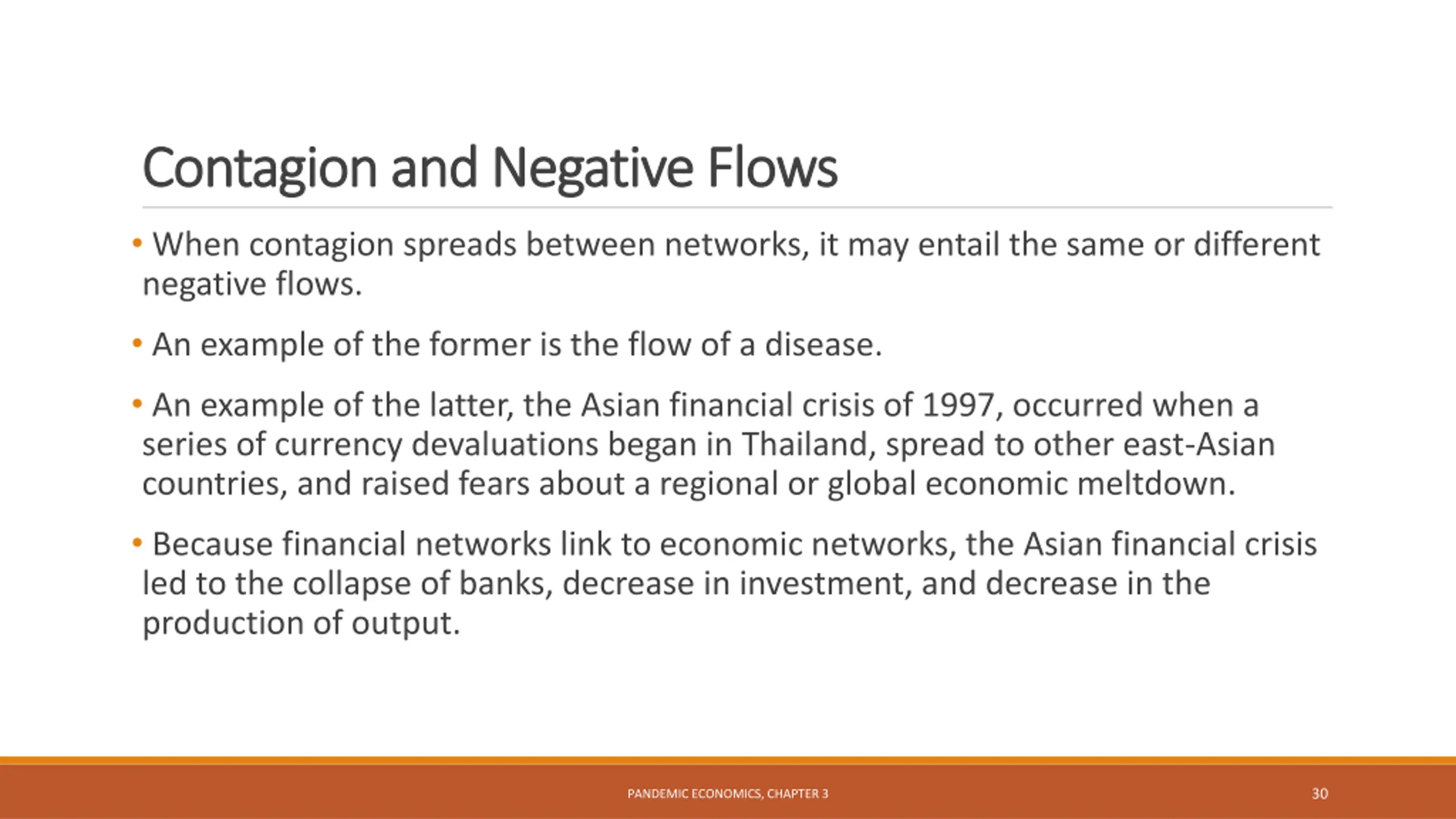 Contagion and Negative Flows Contagion and Negative Flows When contagion spreads between networks, it may entail the same or different negative flows. An example of the former is the flow of a disease. An example of the latter, the Asian financial crisis of 1997, occurred when a series of currency devaluations began in Thailand, spread to other east-Asian countries, and raised fears about a regional or global economic meltdown. Because financial networks link to economic networks, the Asian financial crisis led to the collapse of banks, decrease in investment, and decrease in the production of output. 30 PANDEMIC ECONOMICS, CHAPTER 3