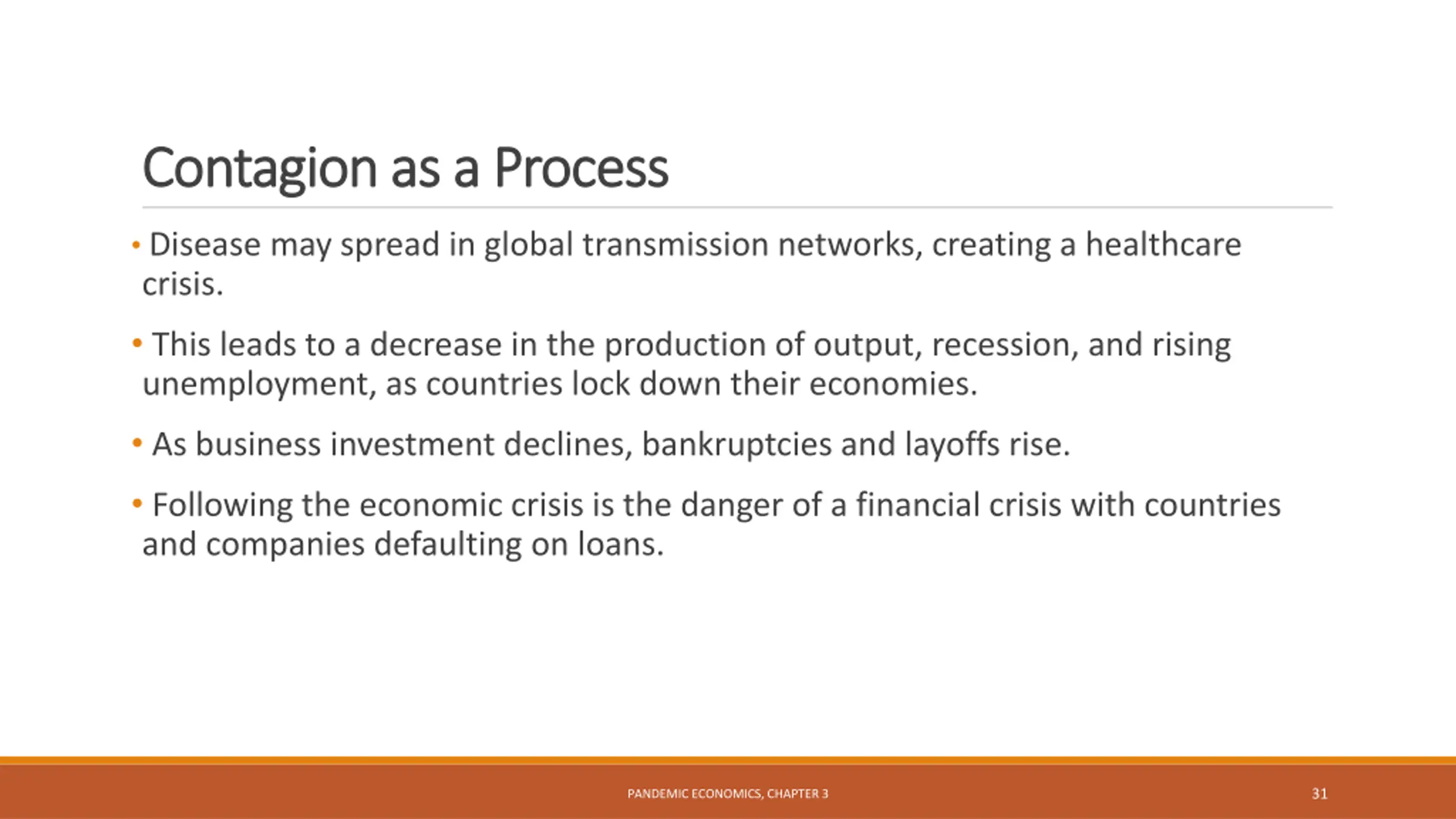 Contagion as a Process Contagion as a Process Disease may spread in global transmission networks, creating a healthcare crisis. This leads to a decrease in the production of output, recession, and rising unemployment, as countries lock down their economies. As business investment declines, bankruptcies and layoffs rise. Following the economic crisis is the danger of a financial crisis with countries and companies defaulting on loans. 31 PANDEMIC ECONOMICS, CHAPTER 3