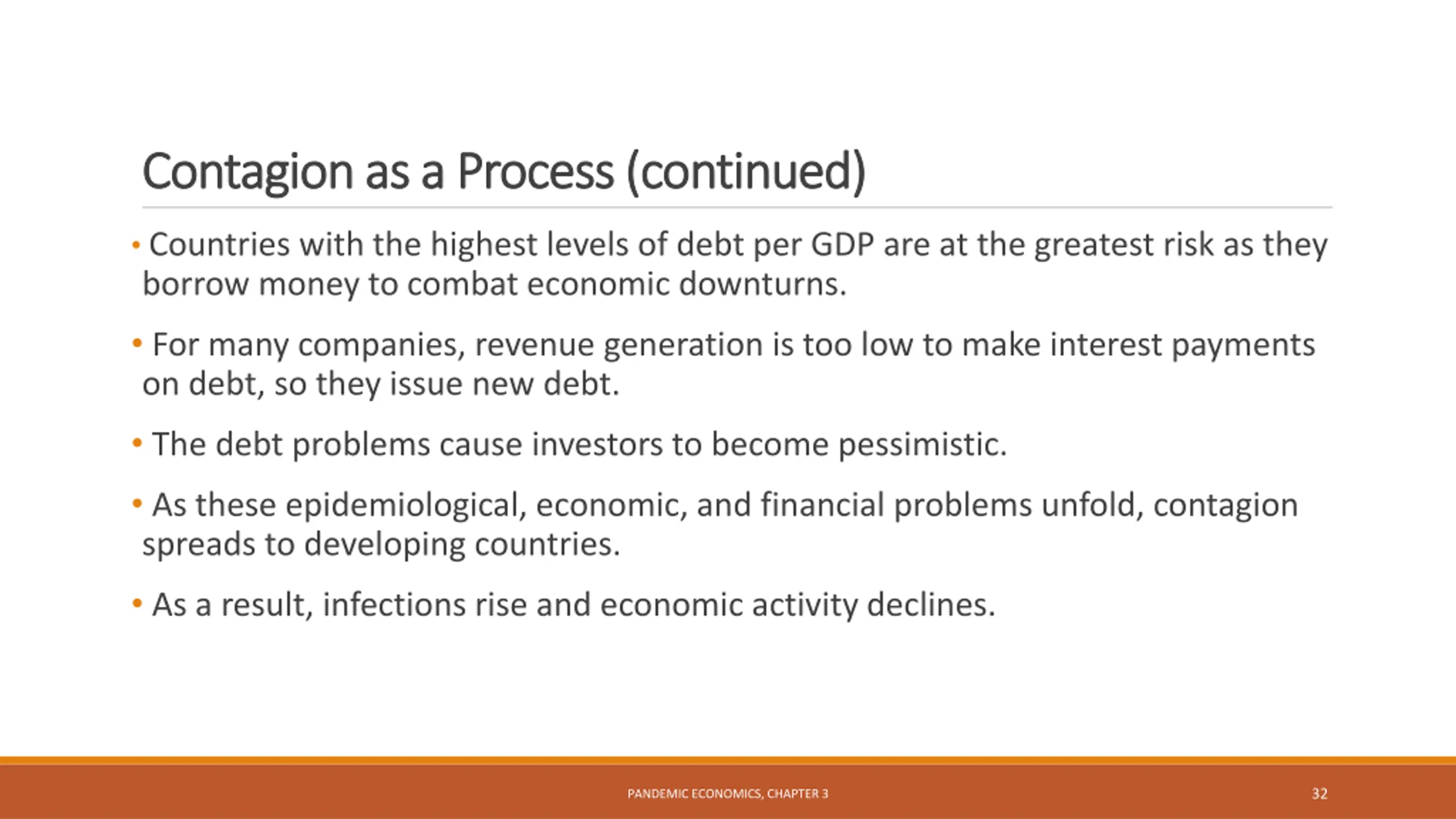 Contagion as a Process (continued) Contagion as a Process (continued) Countries with the highest levels of debt per GDP are at the greatest risk as they borrow money to combat economic downturns. For many companies, revenue generation is too low to make interest payments on debt, so they issue new debt. The debt problems cause investors to become pessimistic. As these epidemiological, economic, and financial problems unfold, contagion spreads to developing countries. As a result, infections rise and economic activity declines. 32 PANDEMIC ECONOMICS, CHAPTER 3