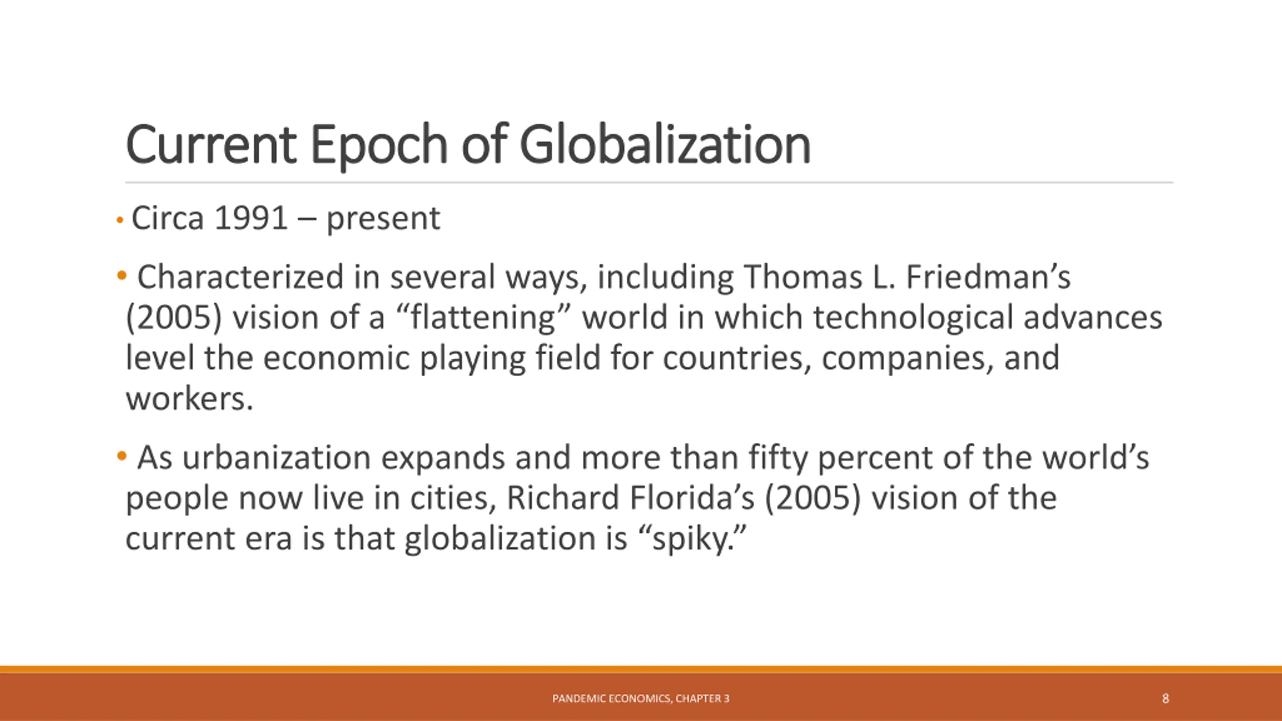 Current Epoch of Globalization Current Epoch of Globalization Circa 1991 present Characterized in several ways, including Thomas L. Friedman s (2005) vision of a flattening world in which technological advances level the economic playing field for countries, companies, and workers. As urbanization expands and more than fifty percent of the world s people now live in cities, Richard Florida s (2005) vision of the current era is that globalization is spiky. 8 PANDEMIC ECONOMICS, CHAPTER 3
