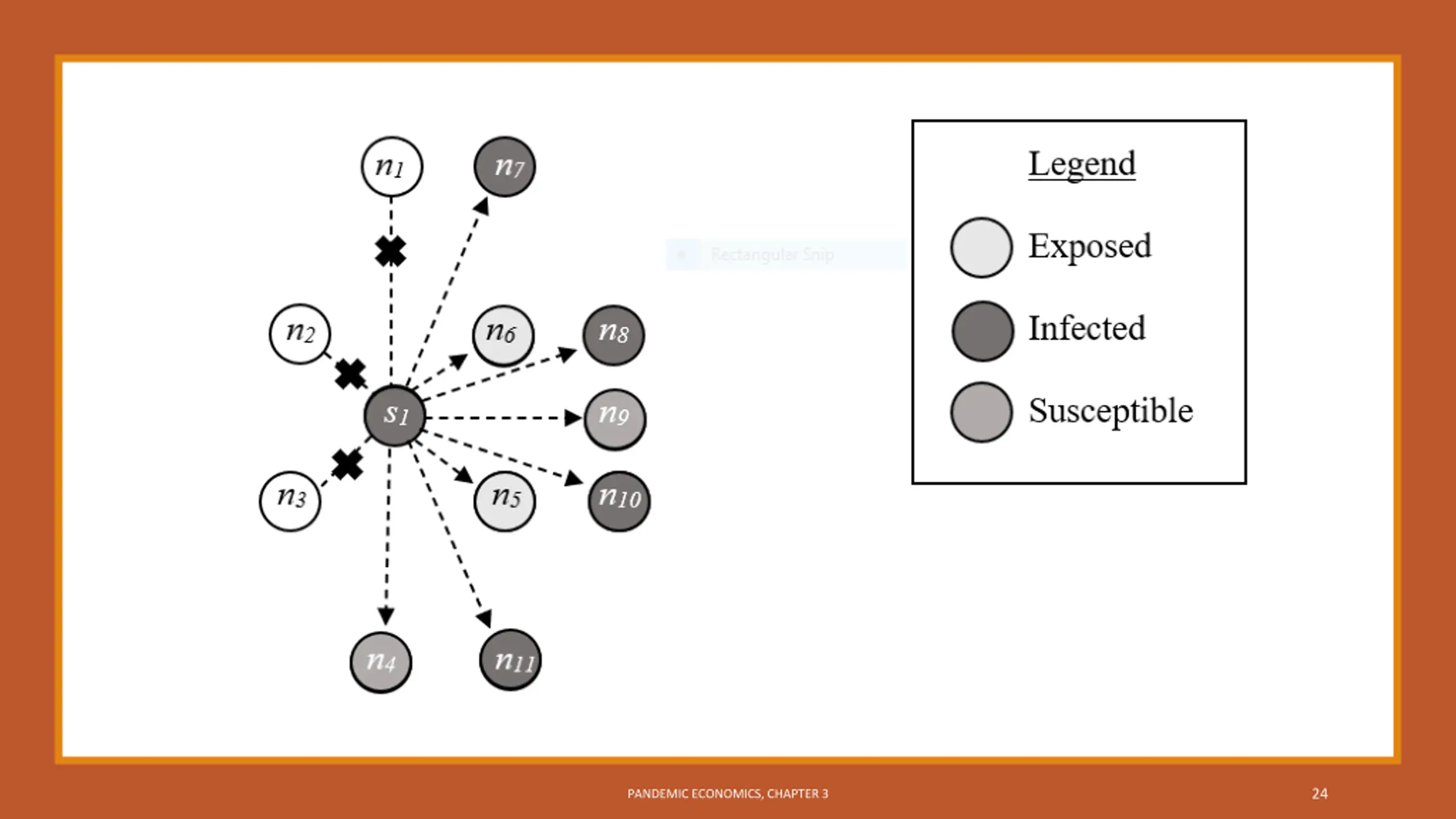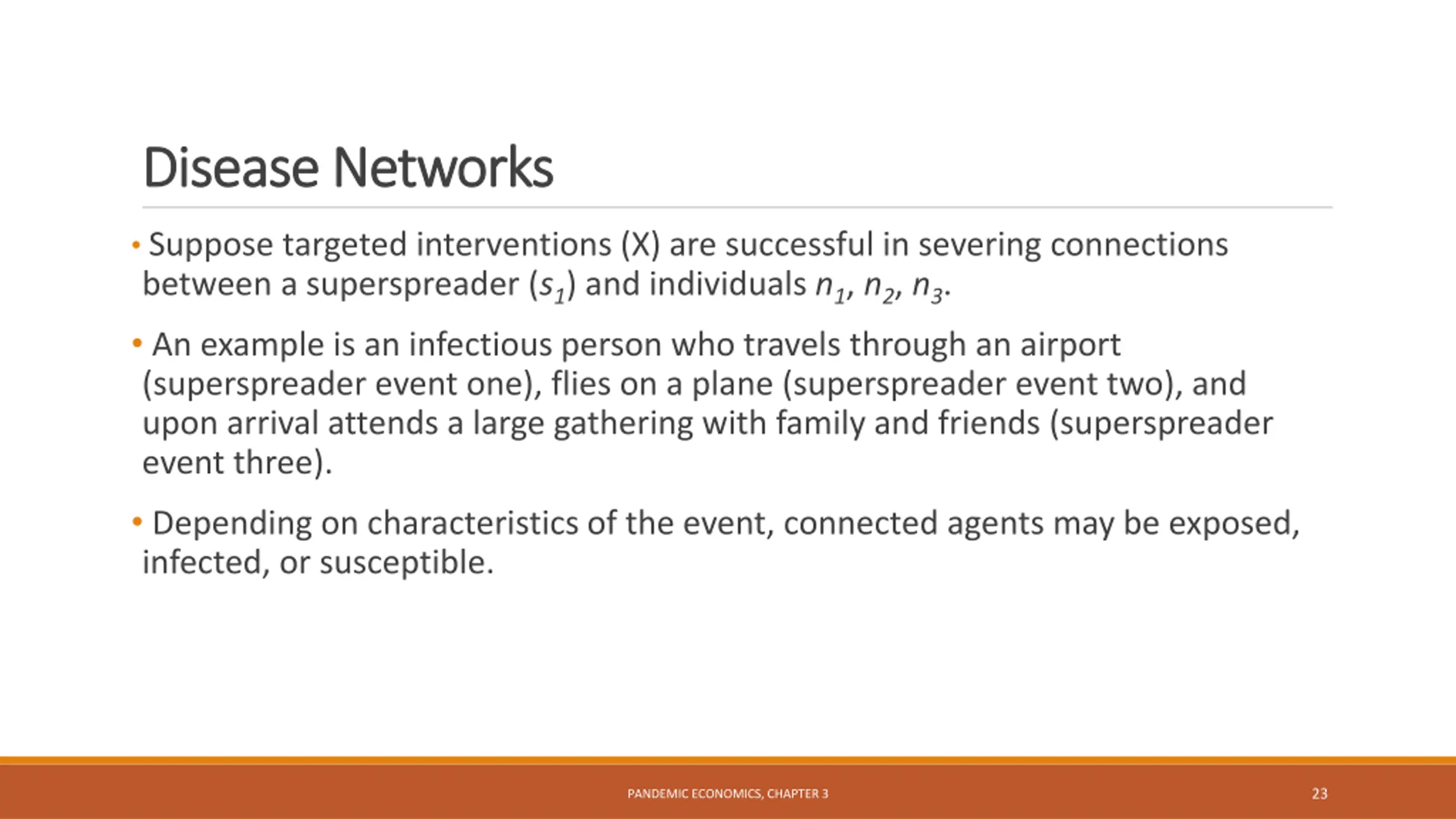 Disease Networks Disease Networks Suppose targeted interventions (X) are successful in severing connections between a superspreader (s1) and individuals n1, n2, n3. An example is an infectious person who travels through an airport (superspreader event one), flies on a plane (superspreader event two), and upon arrival attends a large gathering with family and friends (superspreader event three). Depending on characteristics of the event, connected agents may be exposed, infected, or susceptible. 23 PANDEMIC ECONOMICS, CHAPTER 3