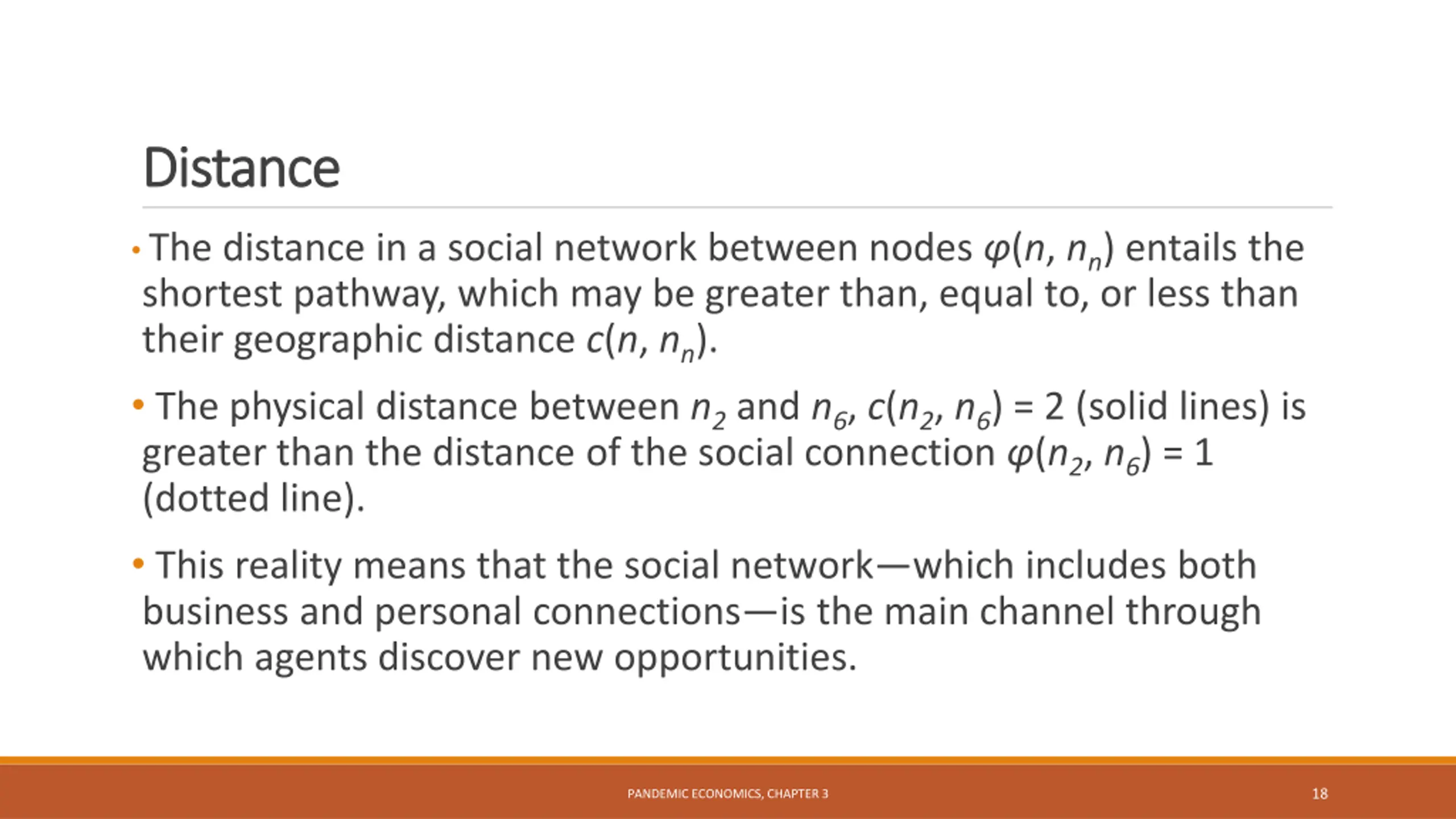 Distance Distance The distance in a social network between nodes (n, nn) entails the shortest pathway, which may be greater than, equal to, or less than their geographic distance c(n, nn). The physical distance between n2 and n6, c(n2, n6) = 2 (solid lines) is greater than the distance of the social connection (n2, n6) = 1 (dotted line). This reality means that the social network which includes both business and personal connections is the main channel through which agents discover new opportunities. 18 PANDEMIC ECONOMICS, CHAPTER 3