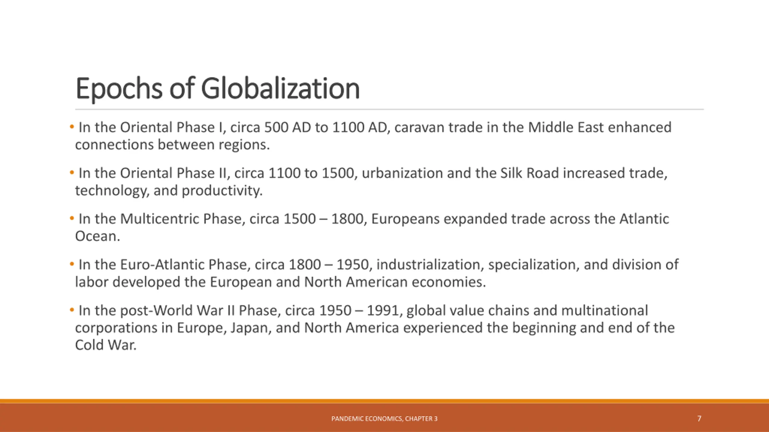 Epochs of Globalization Epochs of Globalization In the Oriental Phase I, circa 500 AD to 1100 AD, caravan trade in the Middle East enhanced connections between regions. In the Oriental Phase II, circa 1100 to 1500, urbanization and the Silk Road increased trade, technology, and productivity. In the Multicentric Phase, circa 1500 1800, Europeans expanded trade across the Atlantic Ocean. In the Euro-Atlantic Phase, circa 1800 1950, industrialization, specialization, and division of labor developed the European and North American economies. In the post-World War II Phase, circa 1950 1991, global value chains and multinational corporations in Europe, Japan, and North America experienced the beginning and end of the Cold War. 7 PANDEMIC ECONOMICS, CHAPTER 3