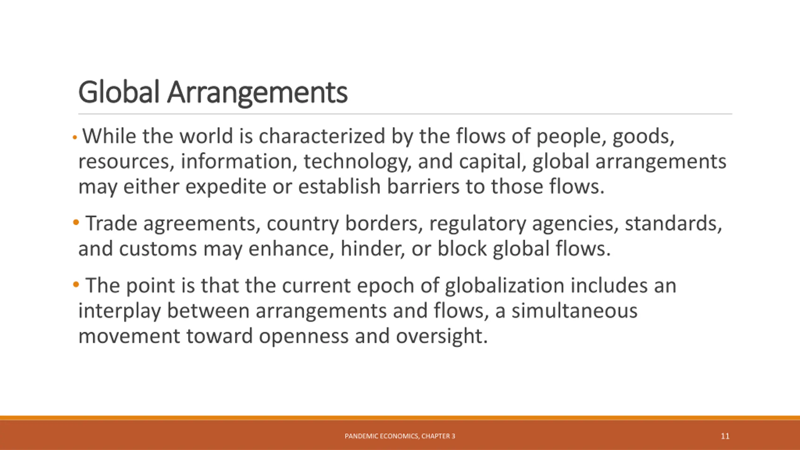 Global Arrangements Global Arrangements While the world is characterized by the flows of people, goods, resources, information, technology, and capital, global arrangements may either expedite or establish barriers to those flows. Trade agreements, country borders, regulatory agencies, standards, and customs may enhance, hinder, or block global flows. The point is that the current epoch of globalization includes an interplay between arrangements and flows, a simultaneous movement toward openness and oversight. 11 PANDEMIC ECONOMICS, CHAPTER 3