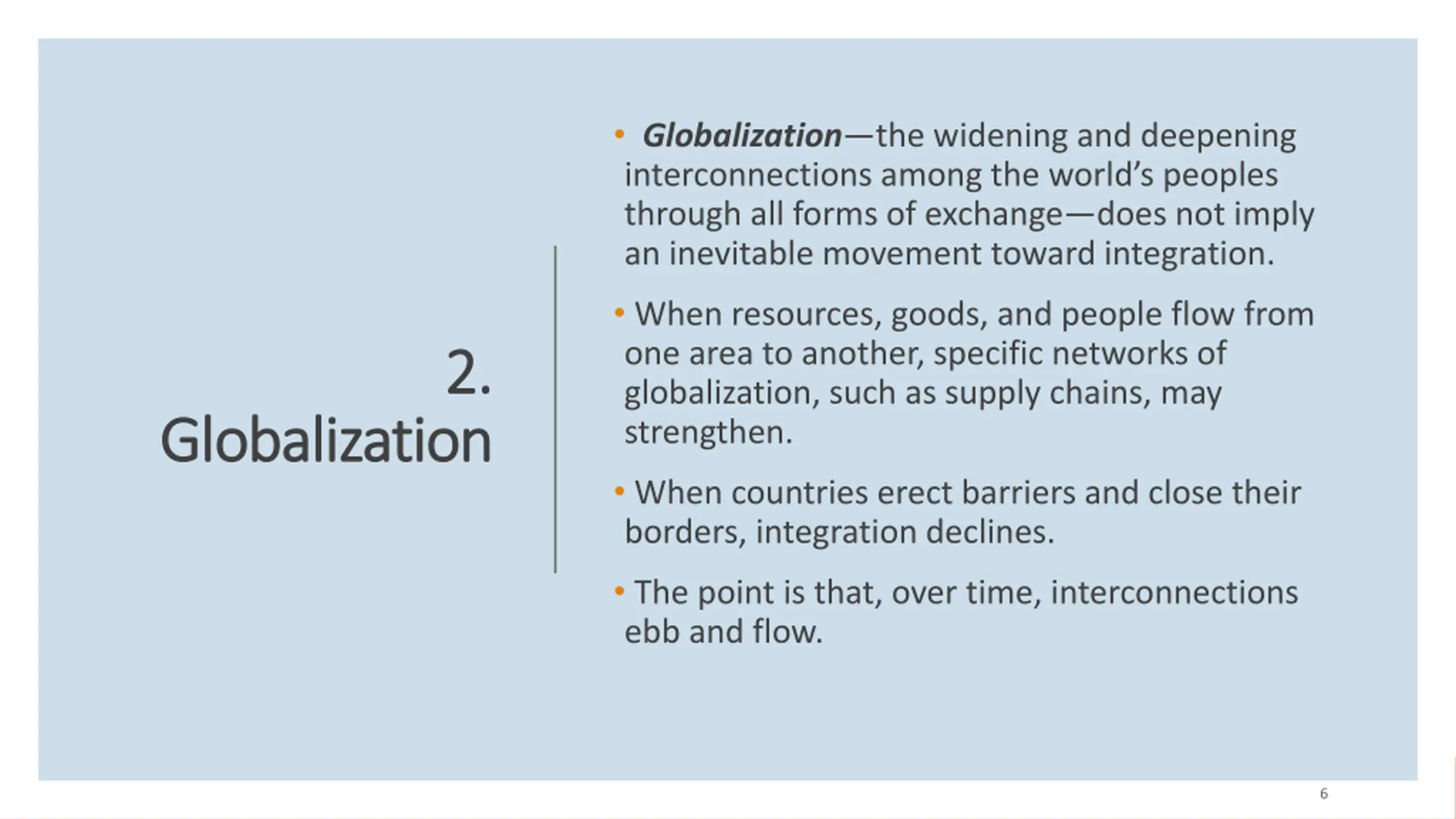 Globalizationthe widening and deepening interconnections among the world s peoples through all forms of exchange does not imply an inevitable movement toward integration. When resources, goods, and people flow from one area to another, specific networks of globalization, such as supply chains, may strengthen. 2. 2. Globalization Globalization When countries erect barriers and close their borders, integration declines. The point is that, over time, interconnections ebb and flow. 6 PANDEMIC ECONOMICS, CHAPTER 3