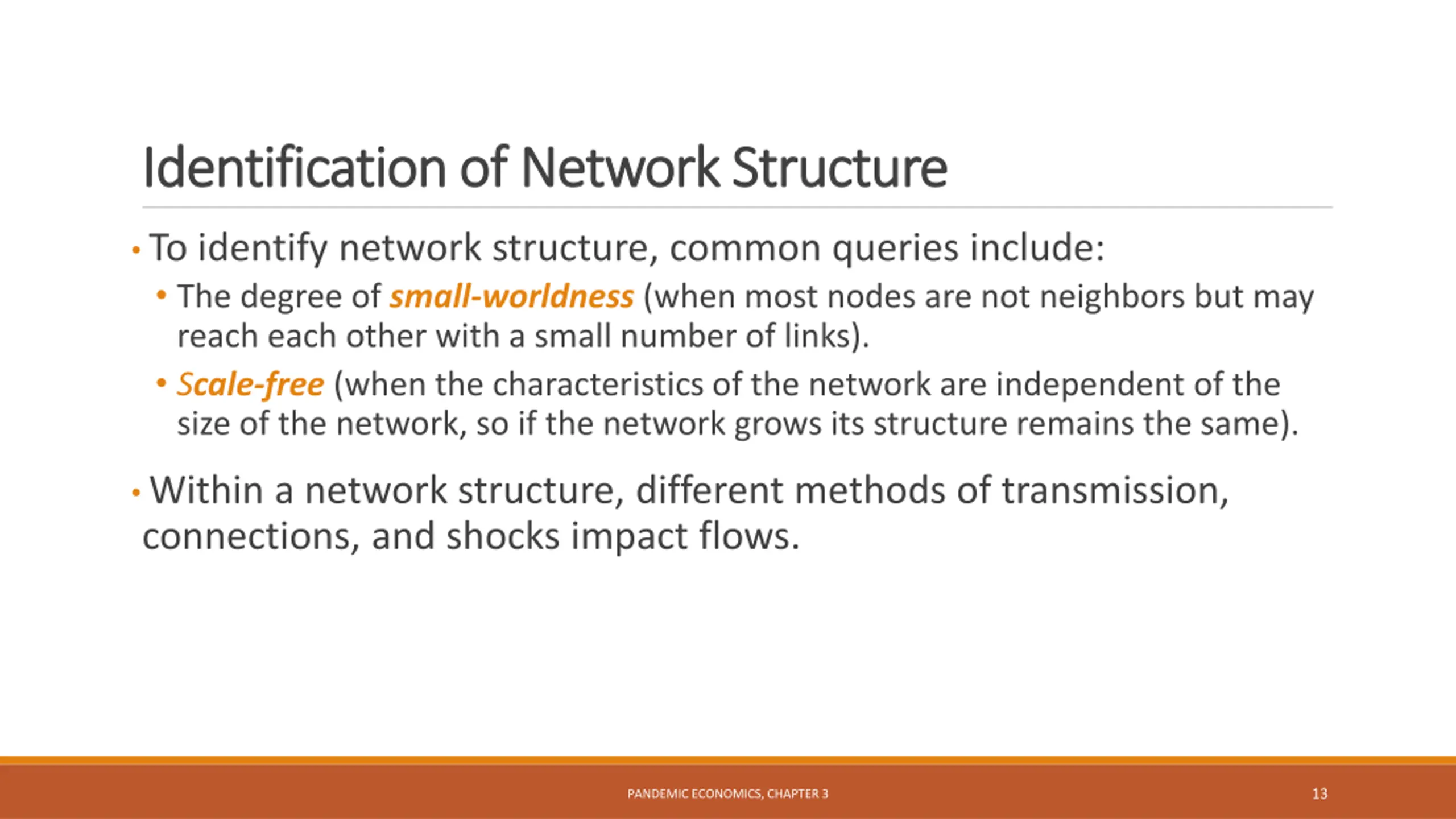 Identification of Network Structure Identification of Network Structure To identify network structure, common queries include: The degree of small-worldness (when most nodes are not neighbors but may reach each other with a small number of links). Scale-free (when the characteristics of the network are independent of the size of the network, so if the network grows its structure remains the same). Within a network structure, different methods of transmission, connections, and shocks impact flows. 13 PANDEMIC ECONOMICS, CHAPTER 3
