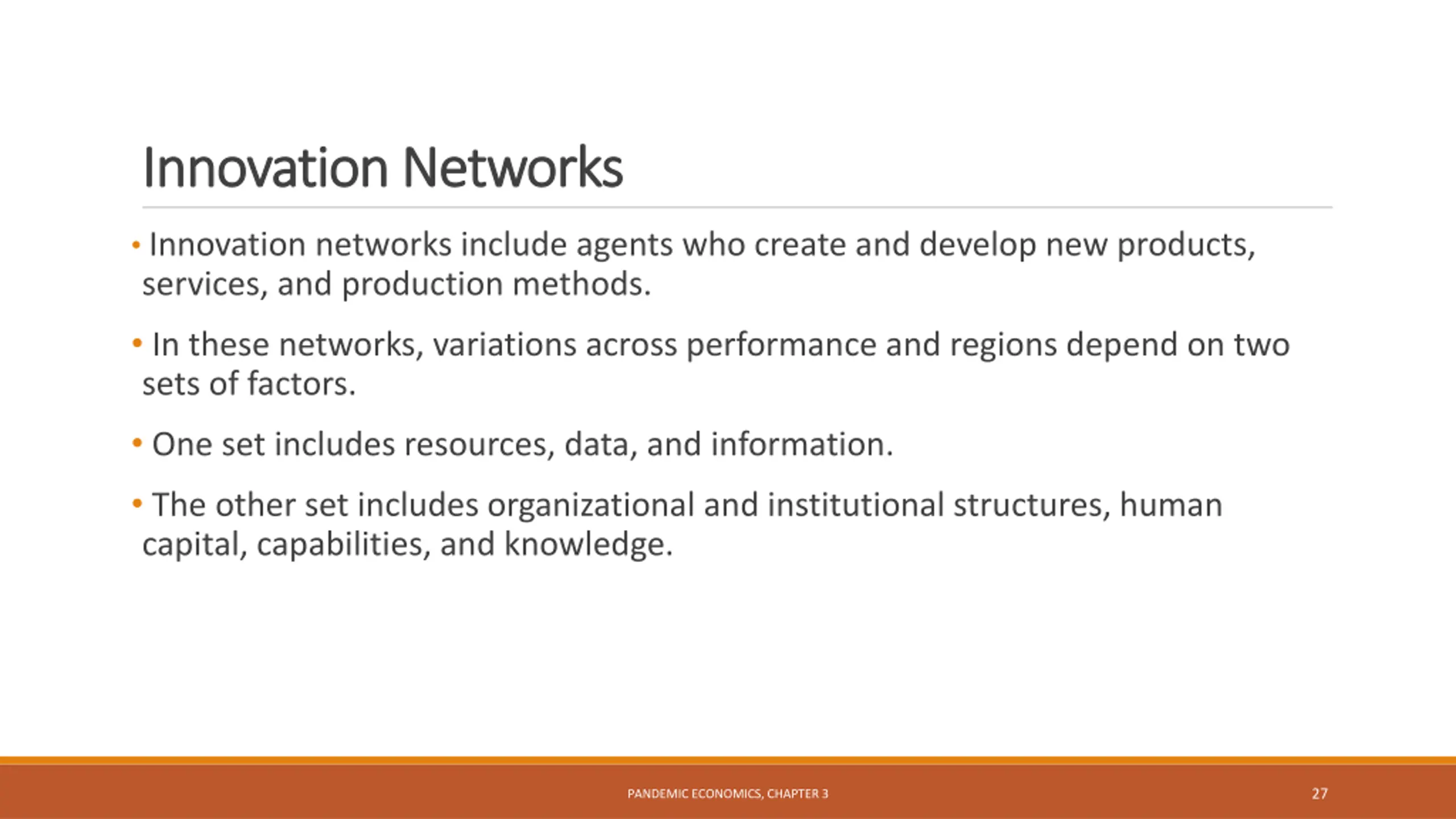 Innovation Networks Innovation Networks Innovation networks include agents who create and develop new products, services, and production methods. In these networks, variations across performance and regions depend on two sets of factors. One set includes resources, data, and information. The other set includes organizational and institutional structures, human capital, capabilities, and knowledge. 27 PANDEMIC ECONOMICS, CHAPTER 3