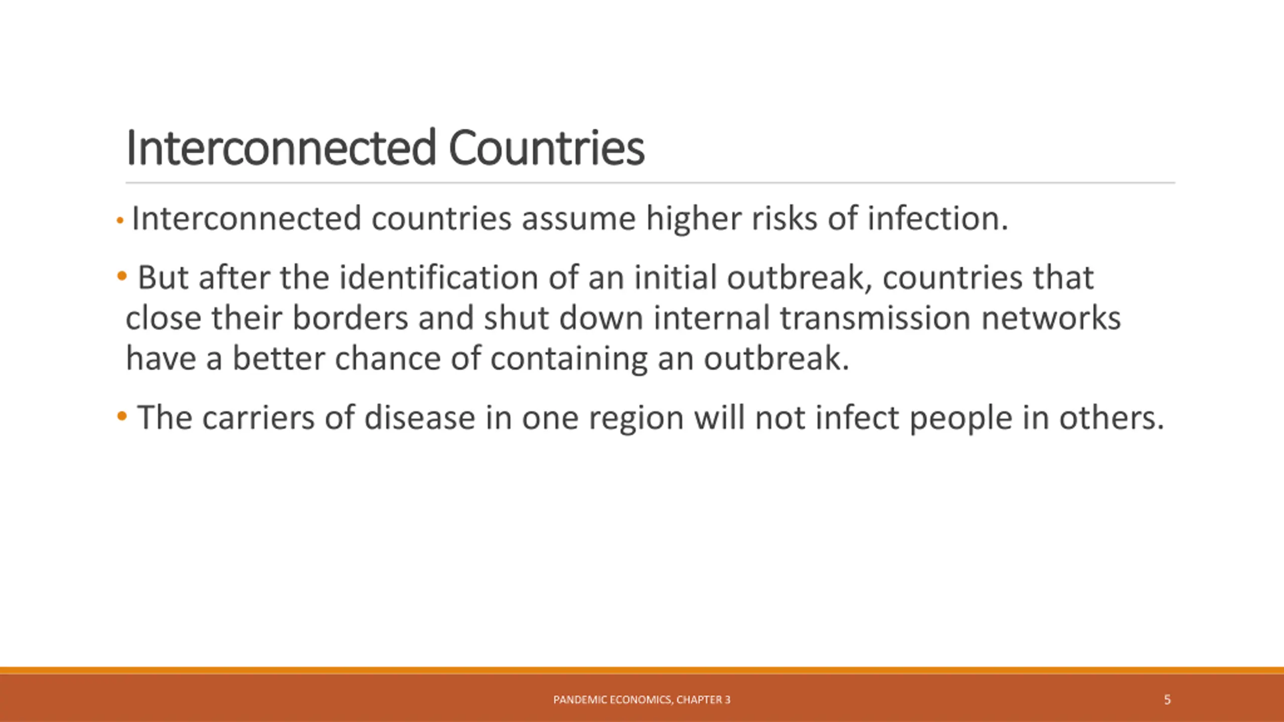 Interconnected Countries Interconnected Countries Interconnected countries assume higher risks of infection. But after the identification of an initial outbreak, countries that close their borders and shut down internal transmission networks have a better chance of containing an outbreak. The carriers of disease in one region will not infect people in others. 5 PANDEMIC ECONOMICS, CHAPTER 3