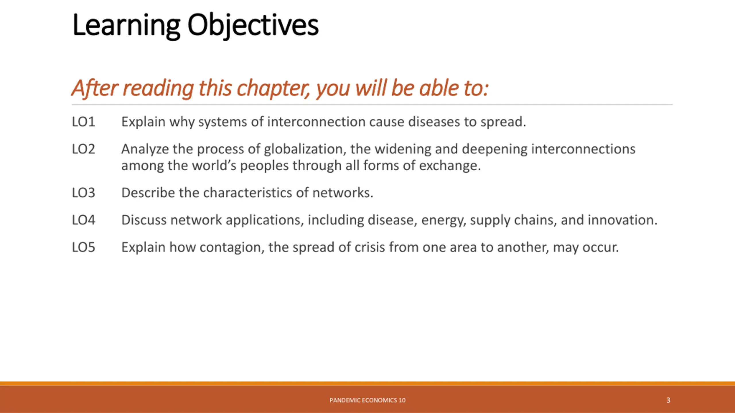 Learning Objectives Learning Objectives After reading this chapter, you will be able to: After reading this chapter, you will be able to: LO1 Explain why systems of interconnection cause diseases to spread. LO2 Analyze the process of globalization, the widening and deepening interconnections among the world s peoples through all forms of exchange. LO3 Describe the characteristics of networks. LO4 Discuss network applications, including disease, energy, supply chains, and innovation. LO5 Explain how contagion, the spread of crisis from one area to another, may occur. 3 PANDEMIC ECONOMICS 10
