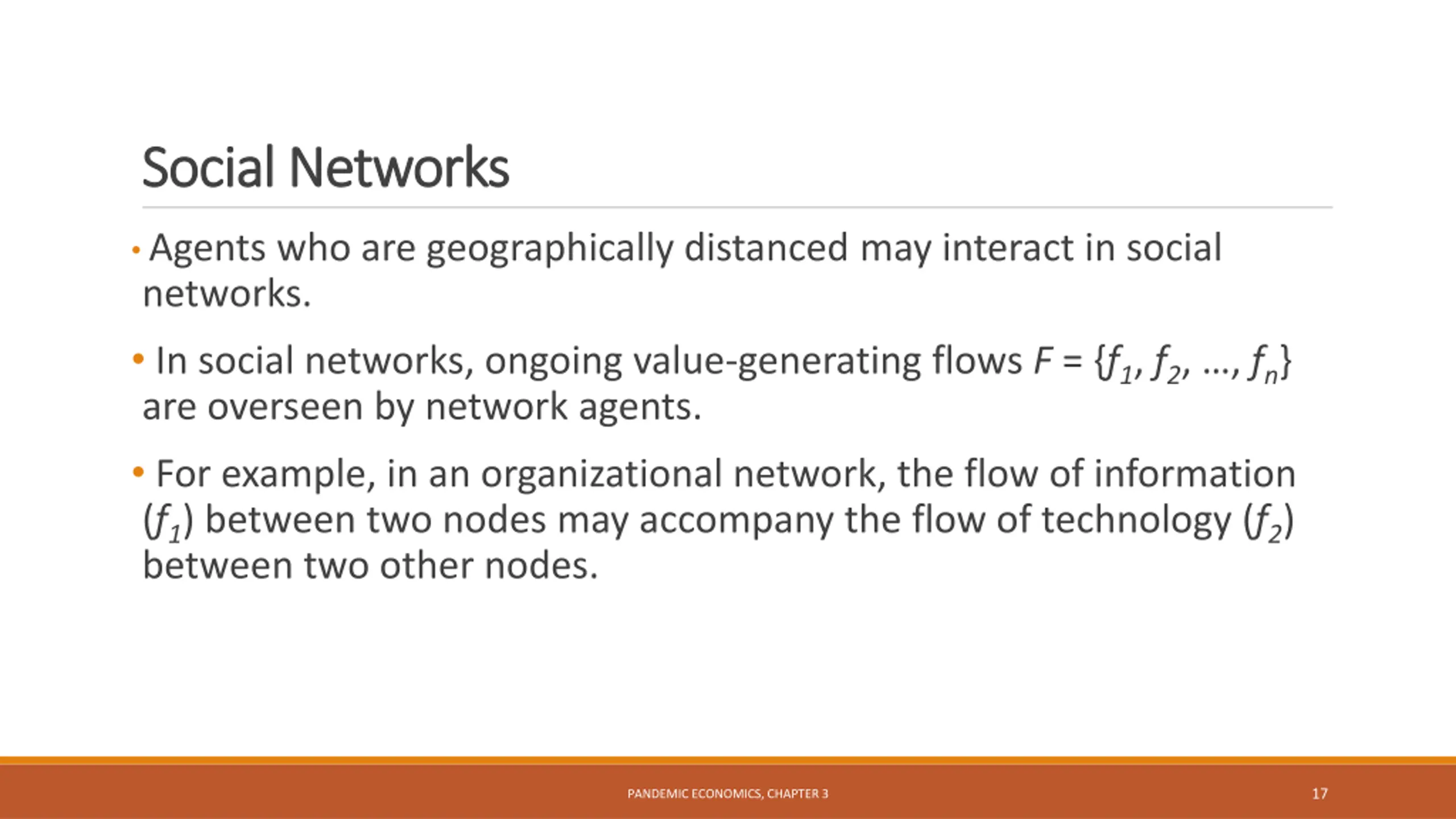 Social Networks Social Networks Agents who are geographically distanced may interact in social networks. In social networks, ongoing value-generating flows F = {f1, f2, , fn} are overseen by network agents. For example, in an organizational network, the flow of information (f1) between two nodes may accompany the flow of technology (f2) between two other nodes. 17 PANDEMIC ECONOMICS, CHAPTER 3