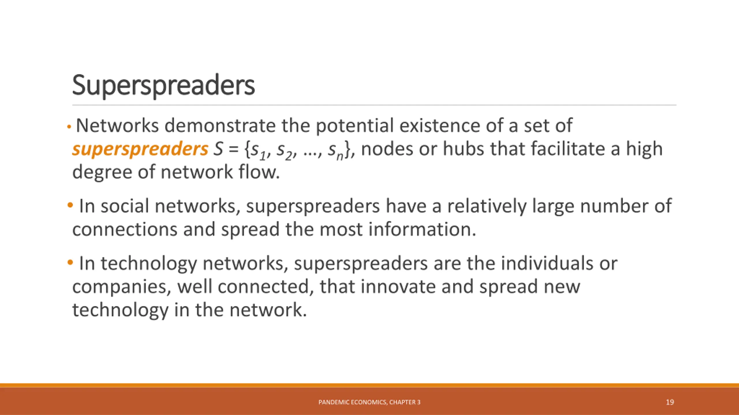 Superspreaders Superspreaders Networks demonstrate the potential existence of a set of superspreadersS = {s1, s2, , sn}, nodes or hubs that facilitate a high degree of network flow. In social networks, superspreaders have a relatively large number of connections and spread the most information. In technology networks, superspreaders are the individuals or companies, well connected, that innovate and spread new technology in the network. 19 PANDEMIC ECONOMICS, CHAPTER 3