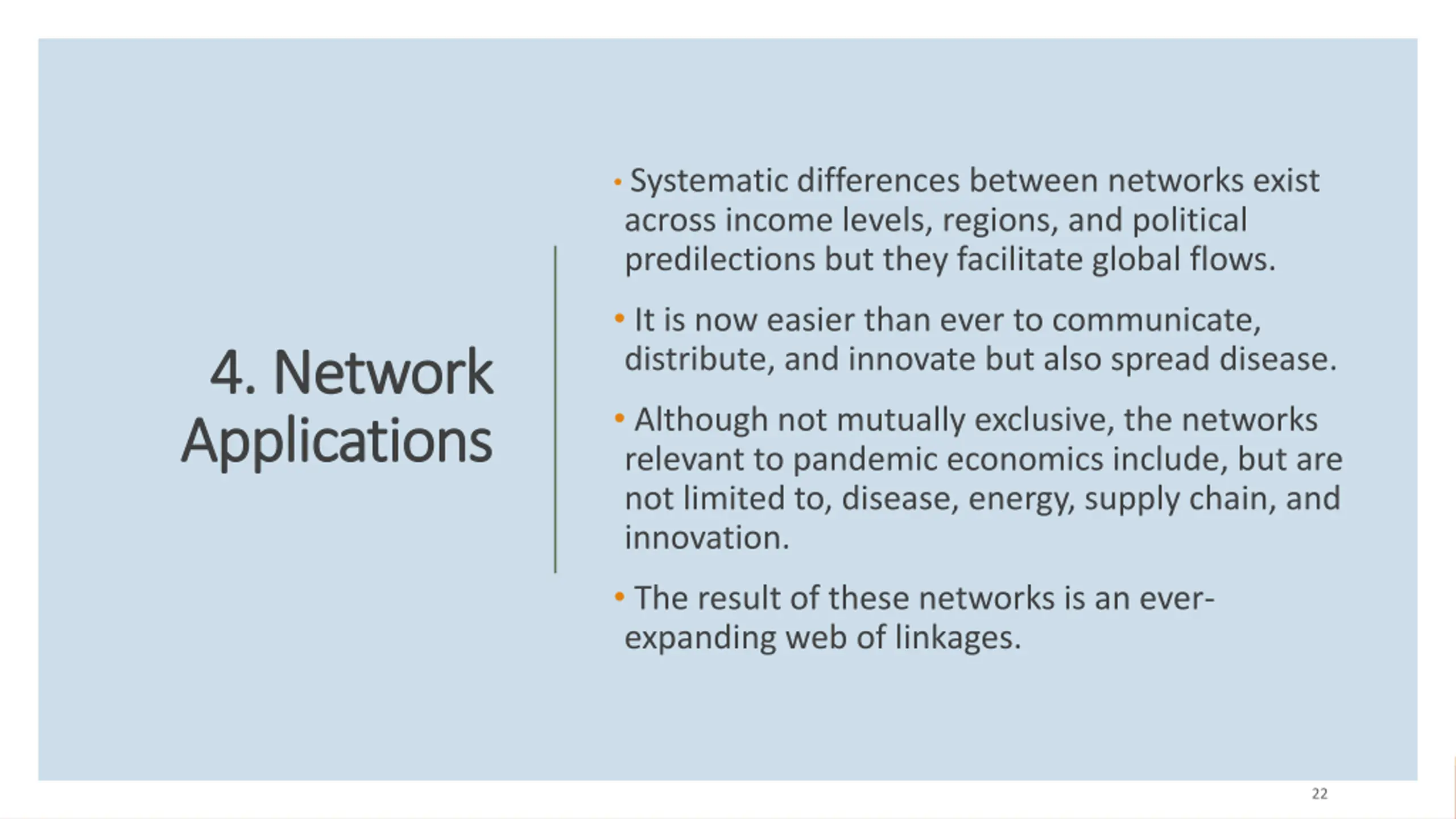 Systematic differences between networks exist across income levels, regions, and political predilections but they facilitate global flows. It is now easier than ever to communicate, distribute, and innovate but also spread disease. 4. Network 4. Network Applications Applications Although not mutually exclusive, the networks relevant to pandemic economics include, but are not limited to, disease, energy, supply chain, and innovation. The result of these networks is an ever- expanding web of linkages. 22 PANDEMIC ECONOMICS, CHAPTER 3