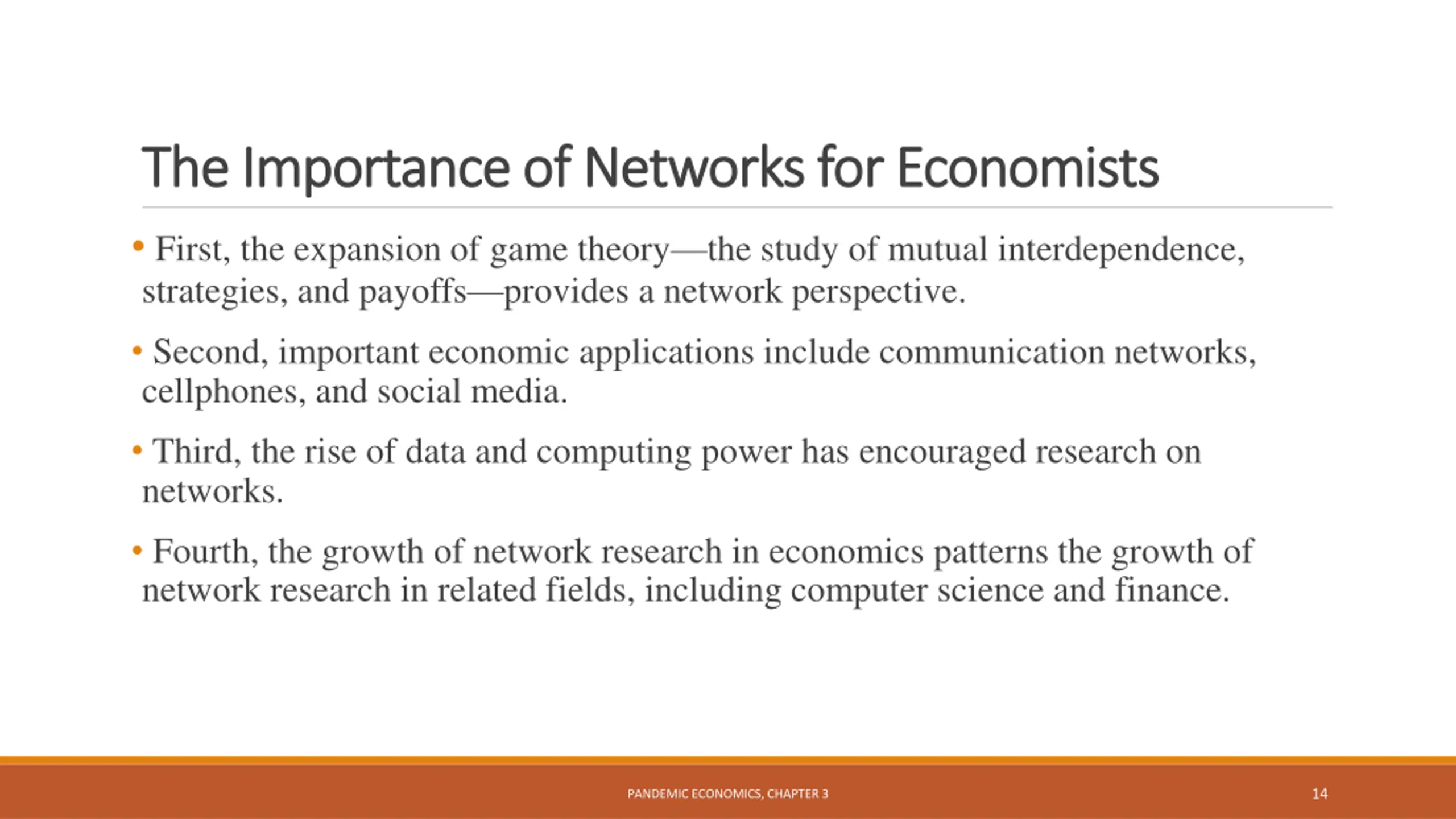 The Importance of Networks for Economists The Importance of Networks for Economists First, the expansion of game theory the study of mutual interdependence, strategies, and payoffs provides a network perspective. Second, important economic applications include communication networks, cellphones, and social media. Third, the rise of data and computing power has encouraged research on networks. Fourth, the growth of network research in economics patterns the growth of network research in related fields, including computer science and finance. 14 PANDEMIC ECONOMICS, CHAPTER 3