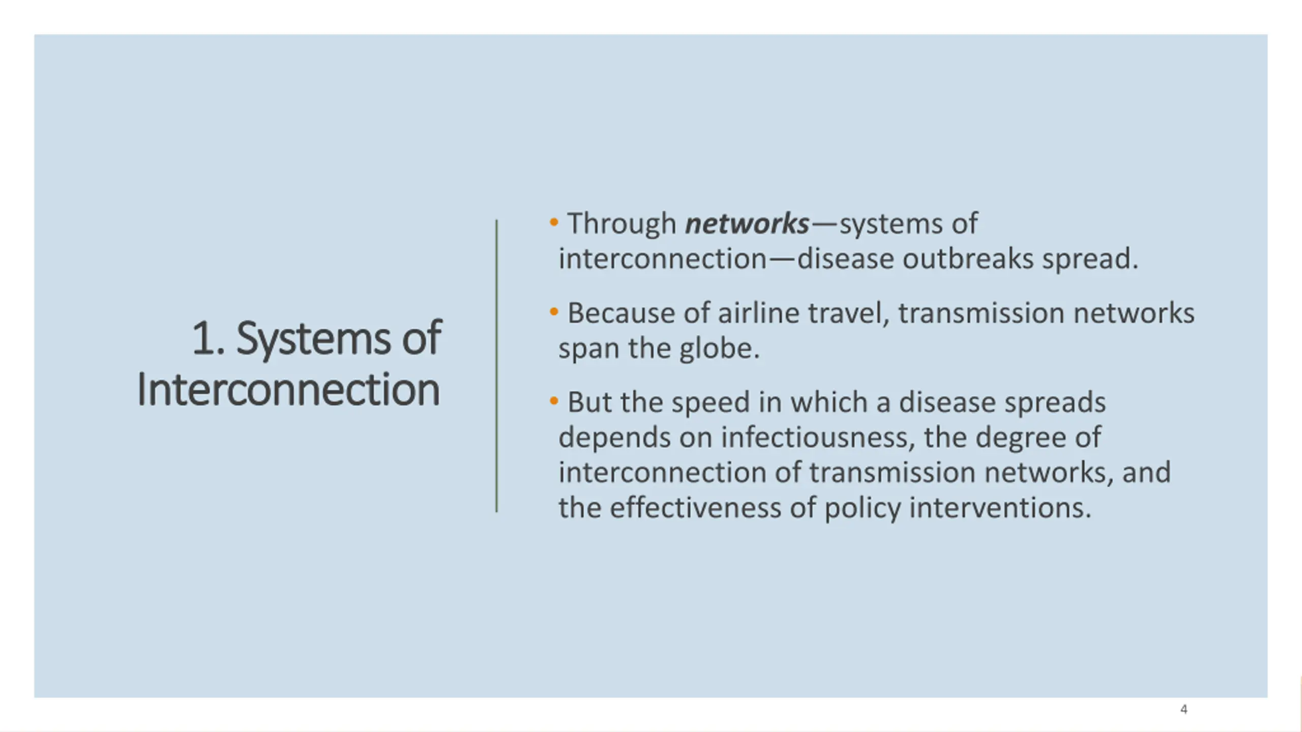 Through networkssystems of interconnection disease outbreaks spread. Because of airline travel, transmission networks span the globe. 1. Systems of 1. Systems of Interconnection Interconnection But the speed in which a disease spreads depends on infectiousness, the degree of interconnection of transmission networks, and the effectiveness of policy interventions. 4 PANDEMIC ECONOMICS, CHAPTER 3