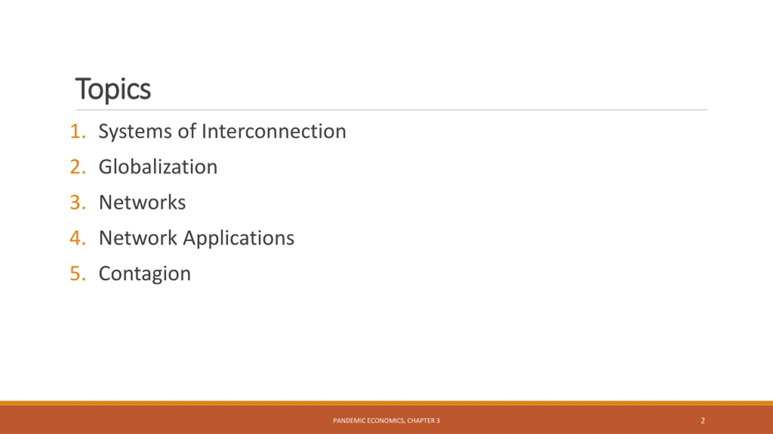 Topics Topics 1. Systems of Interconnection 2. Globalization 3. Networks 4. Network Applications 5. Contagion 2 PANDEMIC ECONOMICS, CHAPTER 3