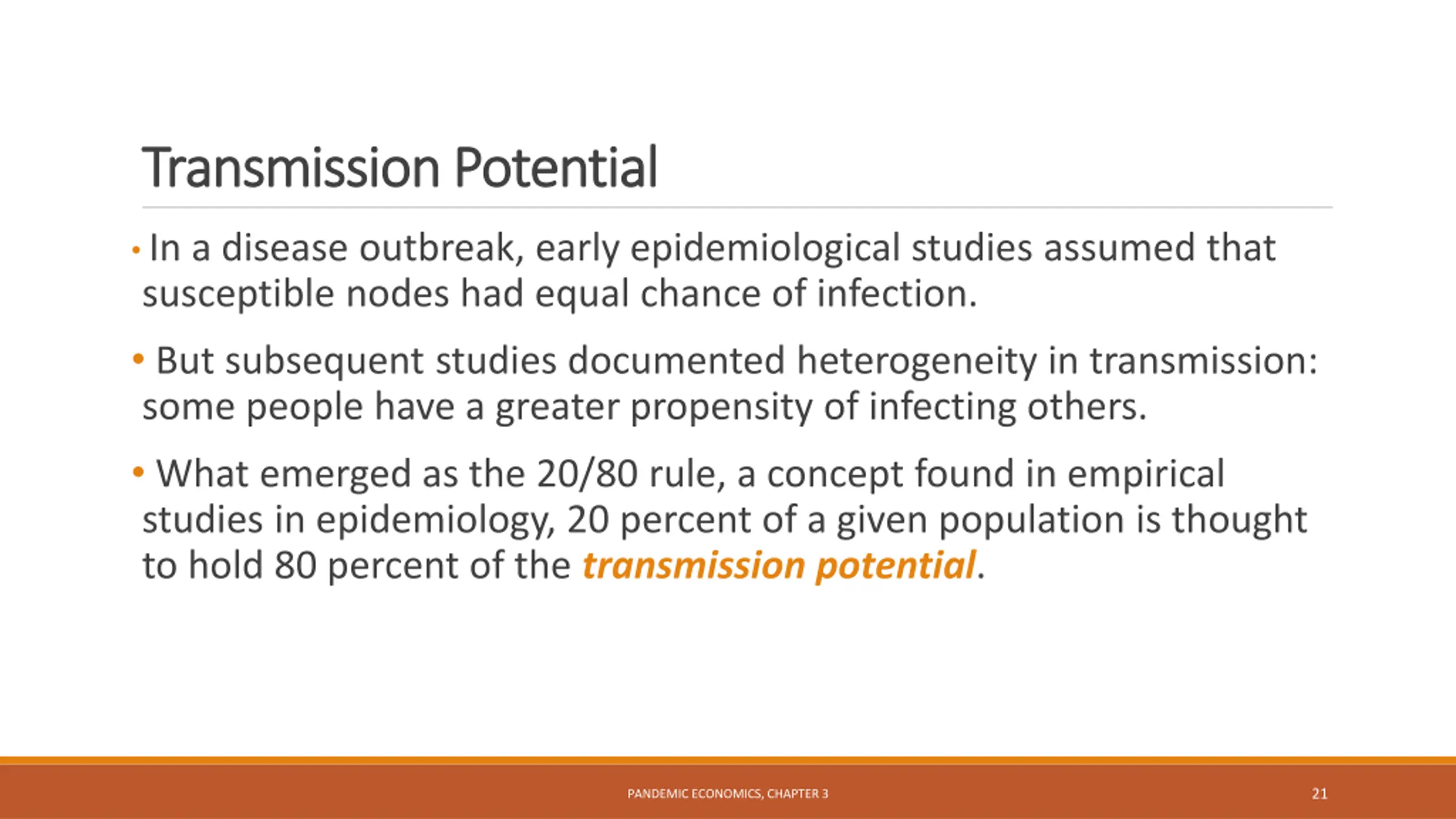 Transmission Potential Transmission Potential In a disease outbreak, early epidemiological studies assumed that susceptible nodes had equal chance of infection. But subsequent studies documented heterogeneity in transmission: some people have a greater propensity of infecting others. What emerged as the 20/80 rule, a concept found in empirical studies in epidemiology, 20 percent of a given population is thought to hold 80 percent of the transmission potential. 21 PANDEMIC ECONOMICS, CHAPTER 3