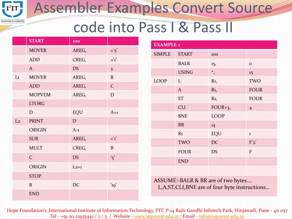 Required Data Structures for Two Pass Assembler MOT Register Value Table Conditional Value Table Source Code Input Prerequisite Intermediate Code Symbol Table Literal Table Pool Table Output Input PASS II PASS I Output Machine Code Hope Foundation s ,International Institute of Information Technology, I IT, P-14 Rajiv Gandhi Infotech Park, Hinjawadi, Pune - 411 057 Tel - +91 20 22933441 / 2 / 3 | Website - www.isquareit.edu.in ; Email - info@isquareit.edu.in