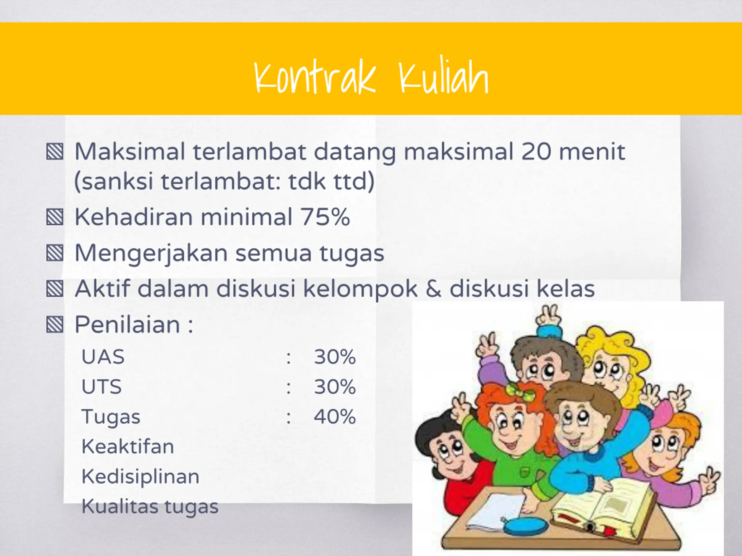 Kontrak Kuliah Maksimal terlambat datang maksimal 20 menit (sanksi terlambat: tdk ttd) Kehadiran minimal 75% Mengerjakan semua tugas Aktif dalam diskusi kelompok & diskusi kelas Penilaian : UAS : 30% UTS : 30% Tugas : 40% Keaktifan Kedisiplinan Kualitas tugas