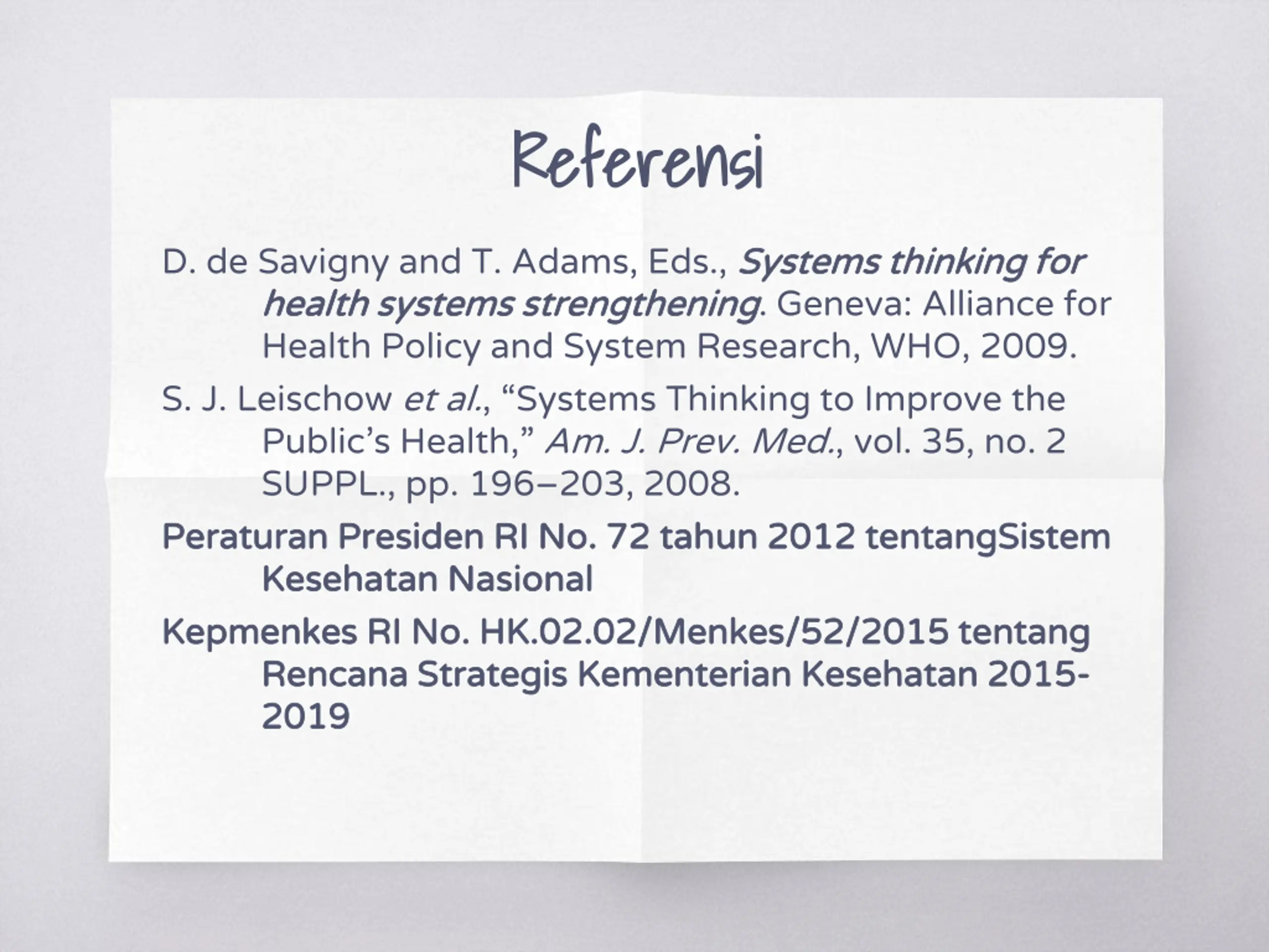 Referensi Referensi D. de Savigny and T. Adams, Eds., Systems thinking for health systems strengthening health systems strengthening. Geneva: Alliance for Health Policy and System Research, WHO, 2009. S. J. Leischow et al., Systems Thinking to Improve the Public s Health, Am. J. Prev. Med., vol. 35, no. 2 SUPPL., pp. 196 203, 2008. Peraturan Presiden RI No. 72 tahun 2012 tentangSistem Peraturan Presiden RI No. 72 tahun 2012 tentangSistem Kesehatan Nasional Kesehatan Nasional Kepmenkes RI No. HK.02.02/Menkes/52/2015 tentang Kepmenkes RI No. HK.02.02/Menkes/52/2015 tentang Rencana Strategis Kementerian Kesehatan 2015 Rencana Strategis Kementerian Kesehatan 2015- - 2019 2019 Systems thinking for