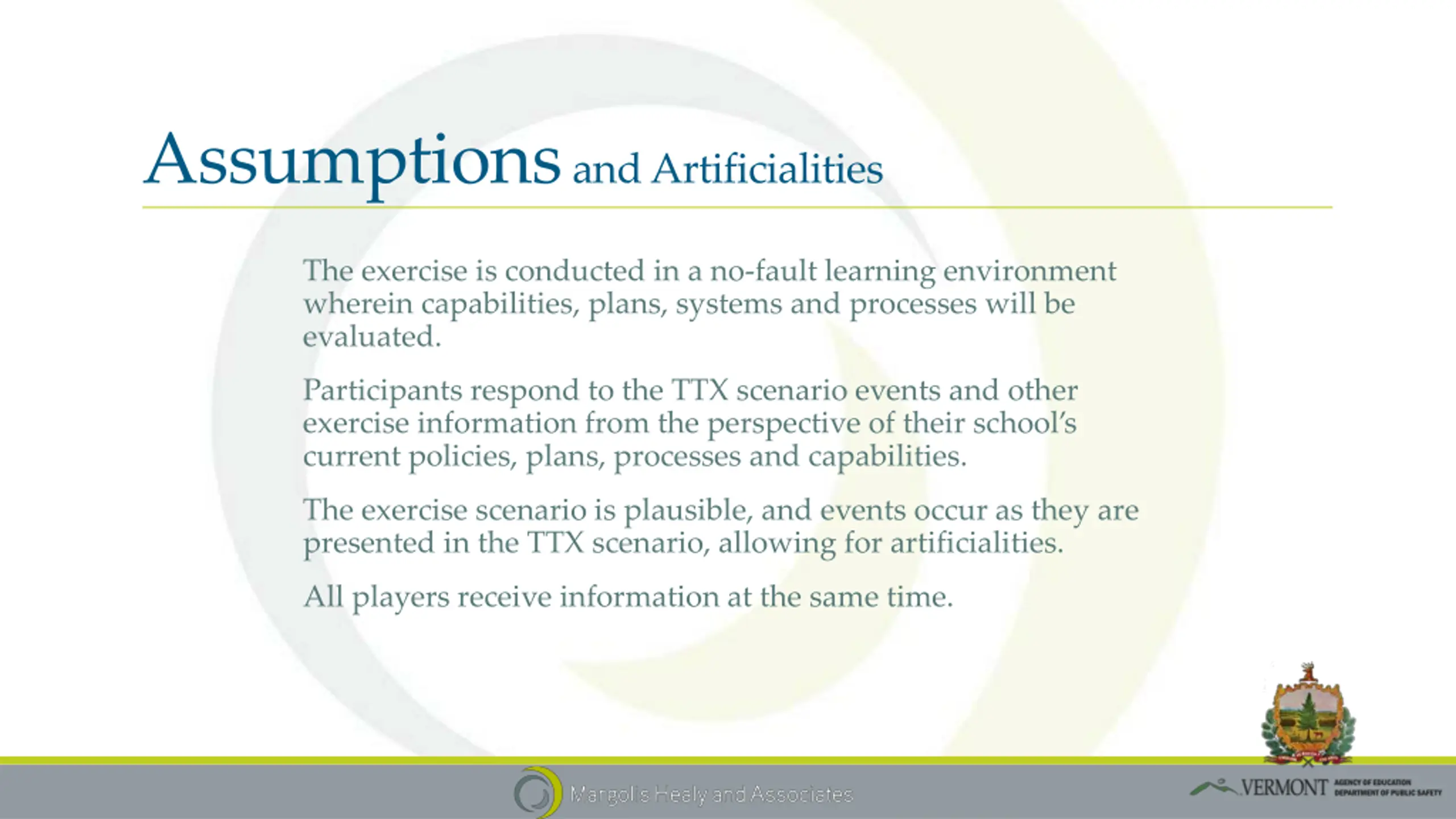 Assumptions and Artificialities The exercise is conducted in a no-fault learning environment wherein capabilities, plans, systems and processes will be evaluated. Participants respond to the TTX scenario events and other exercise information from the perspective of their school s current policies, plans, processes and capabilities. The exercise scenario is plausible, and events occur as they are presented in the TTX scenario, allowing for artificialities. All players receive information at the same time.