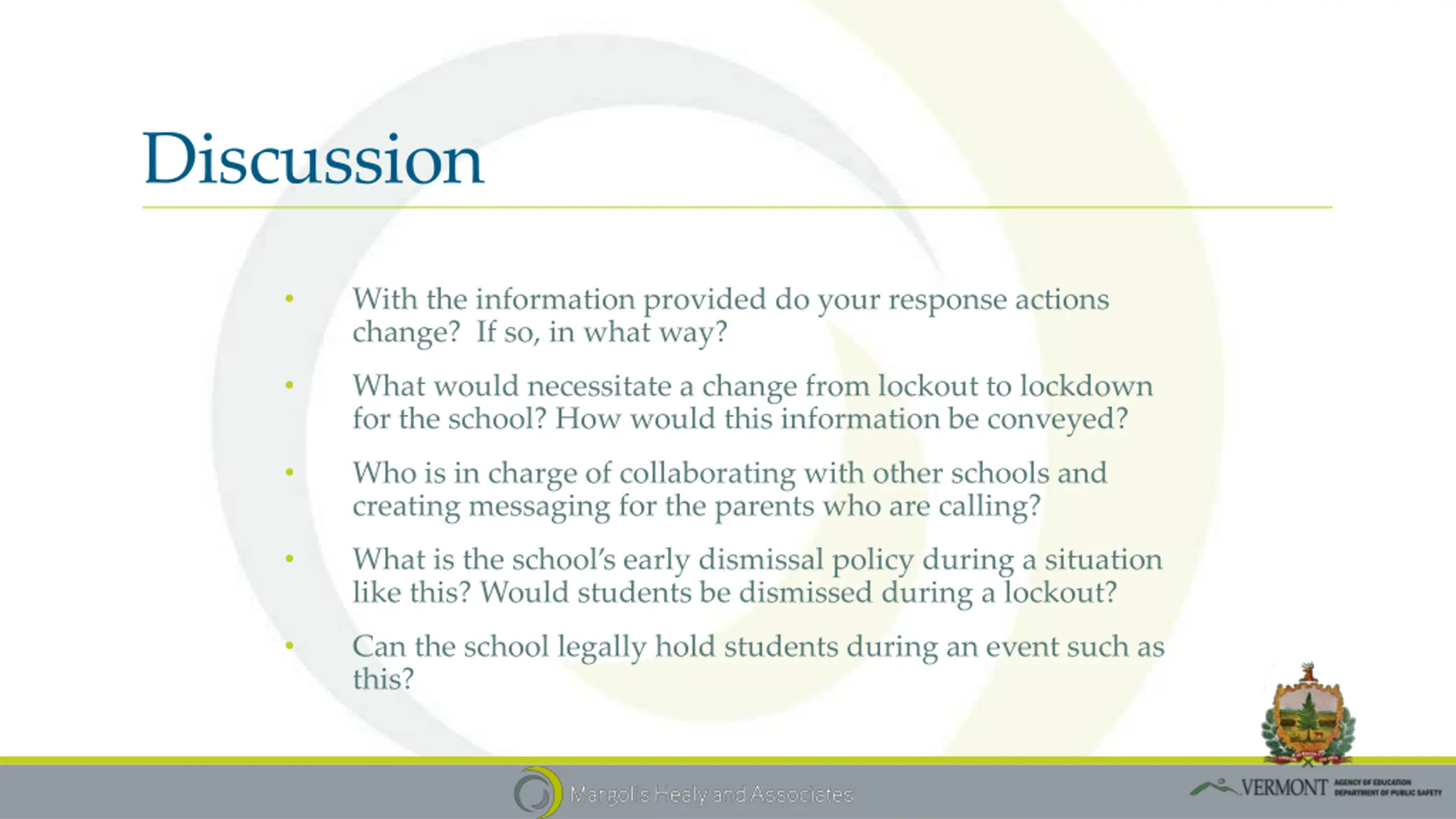 Discussion With the information provided do your response actions change? If so, in what way? What would necessitate a change from lockout to lockdown for the school? How would this information be conveyed? Who is in charge of collaborating with other schools and creating messaging for the parents who are calling? What is the school s early dismissal policy during a situation like this? Would students be dismissed during a lockout? Can the school legally hold students during an event such as this?