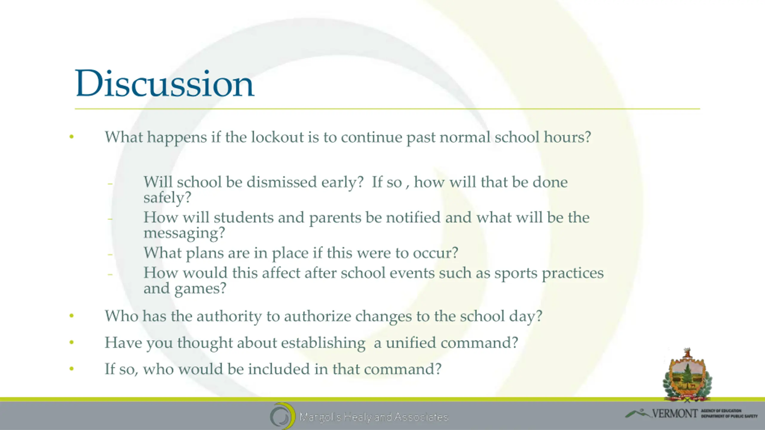 Discussion What happens if the lockout is to continue past normal school hours? Will school be dismissed early? If so , how will that be done safely? How will students and parents be notified and what will be the messaging? What plans are in place if this were to occur? How would this affect after school events such as sports practices and games? Who has the authority to authorize changes to the school day? Have you thought about establishing a unified command? If so, who would be included in that command?