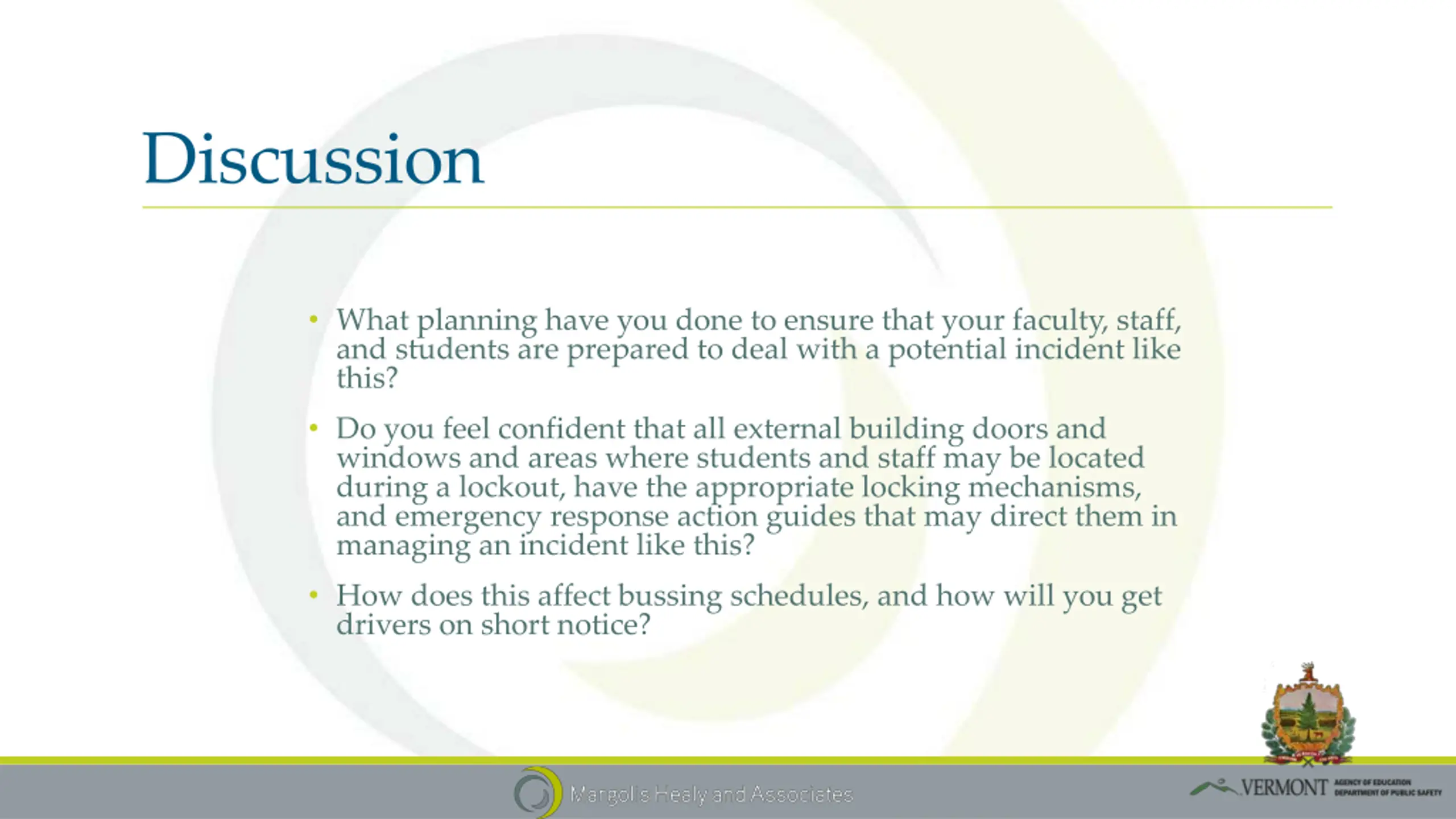 Discussion What planning have you done to ensure that your faculty, staff, and students are prepared to deal with a potential incident like this? Do you feel confident that all external building doors and windows and areas where students and staff may be located during a lockout, have the appropriate locking mechanisms, and emergency response action guides that may direct them in managing an incident like this? How does this affect bussing schedules, and how will you get drivers on short notice?