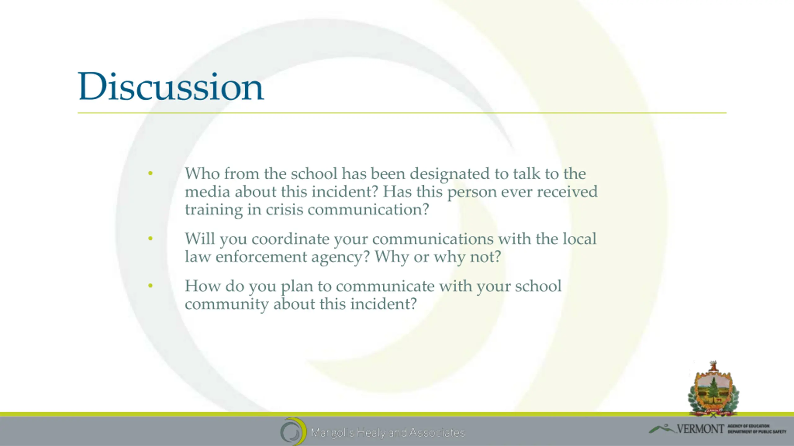 Discussion Who from the school has been designated to talk to the media about this incident? Has this person ever received training in crisis communication? Will you coordinate your communications with the local law enforcement agency? Why or why not? How do you plan to communicate with your school community about this incident?