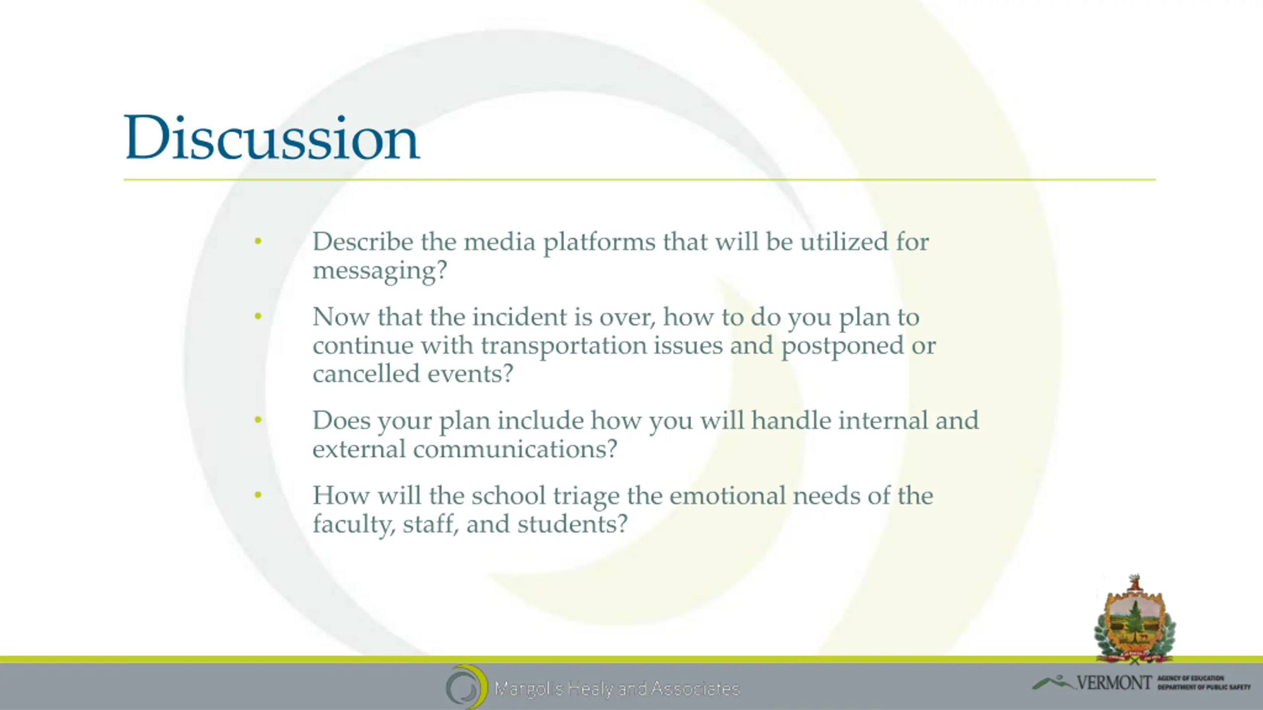 Discussion Describe the media platforms that will be utilized for messaging? Now that the incident is over, how to do you plan to continue with transportation issues and postponed or cancelled events? Does your plan include how you will handle internal and external communications? How will the school triage the emotional needs of the faculty, staff, and students?