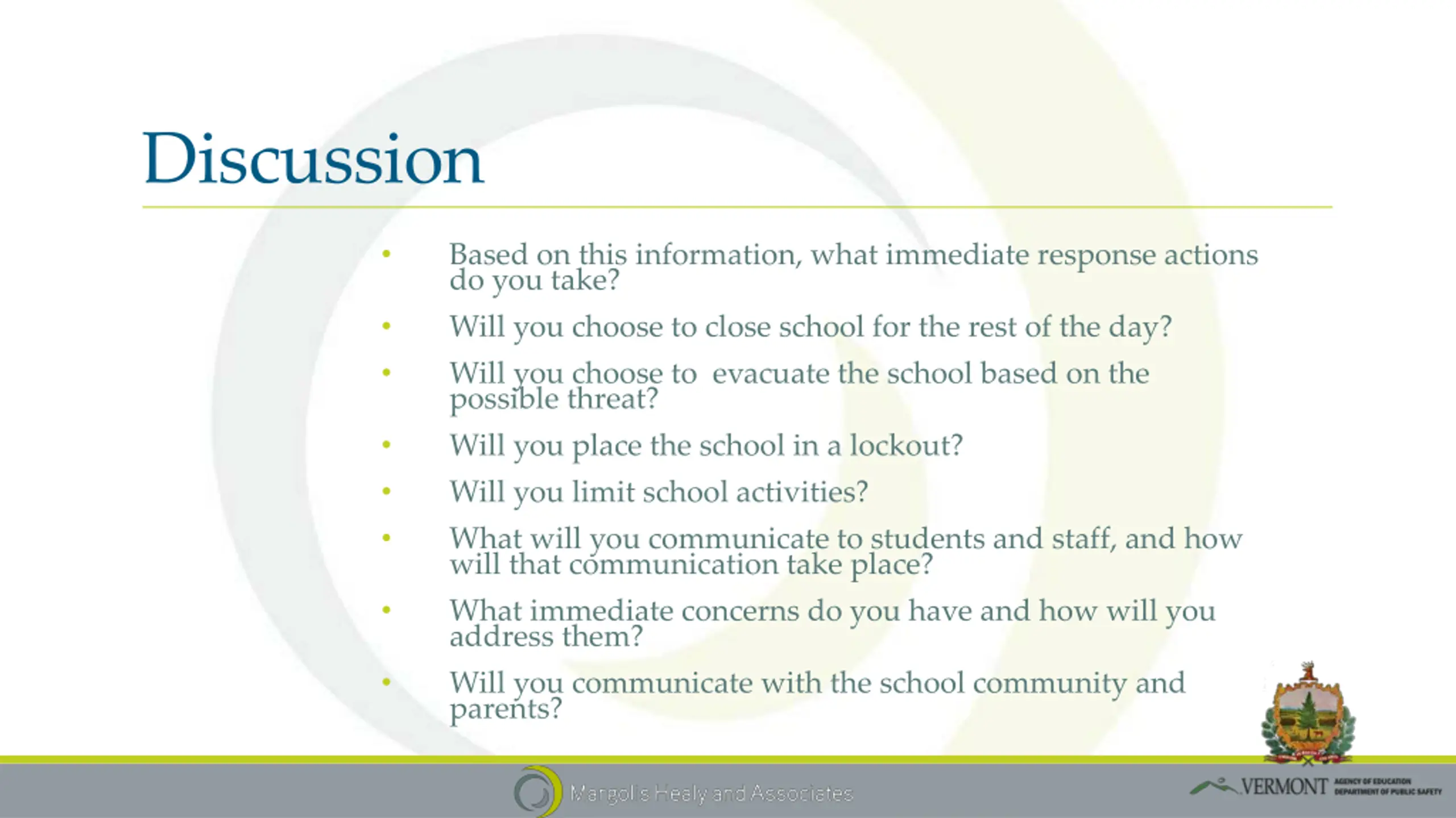 Discussion Based on this information, what immediate response actions do you take? Will you choose to close school for the rest of the day? Will you choose to evacuate the school based on the possible threat? Will you place the school in a lockout? Will you limit school activities? What will you communicate to students and staff, and how will that communication take place? What immediate concerns do you have and how will you address them? Will you communicate with the school community and parents?
