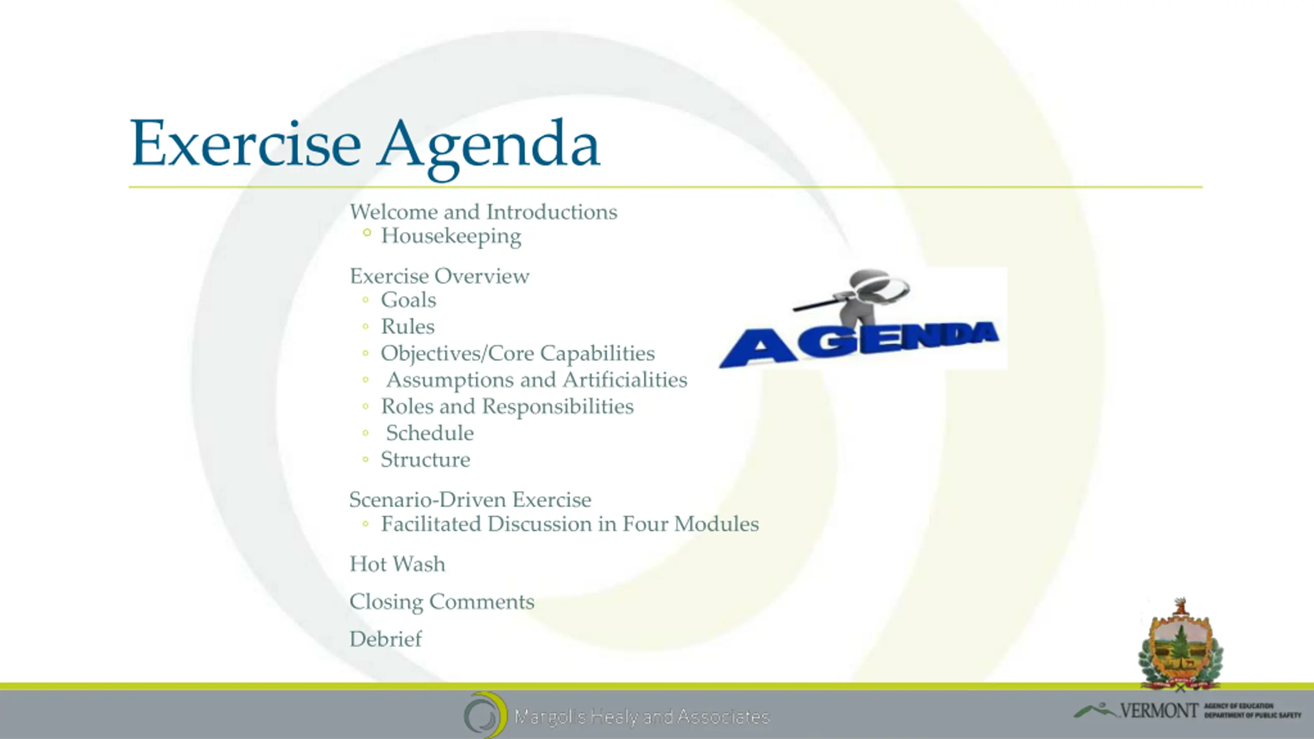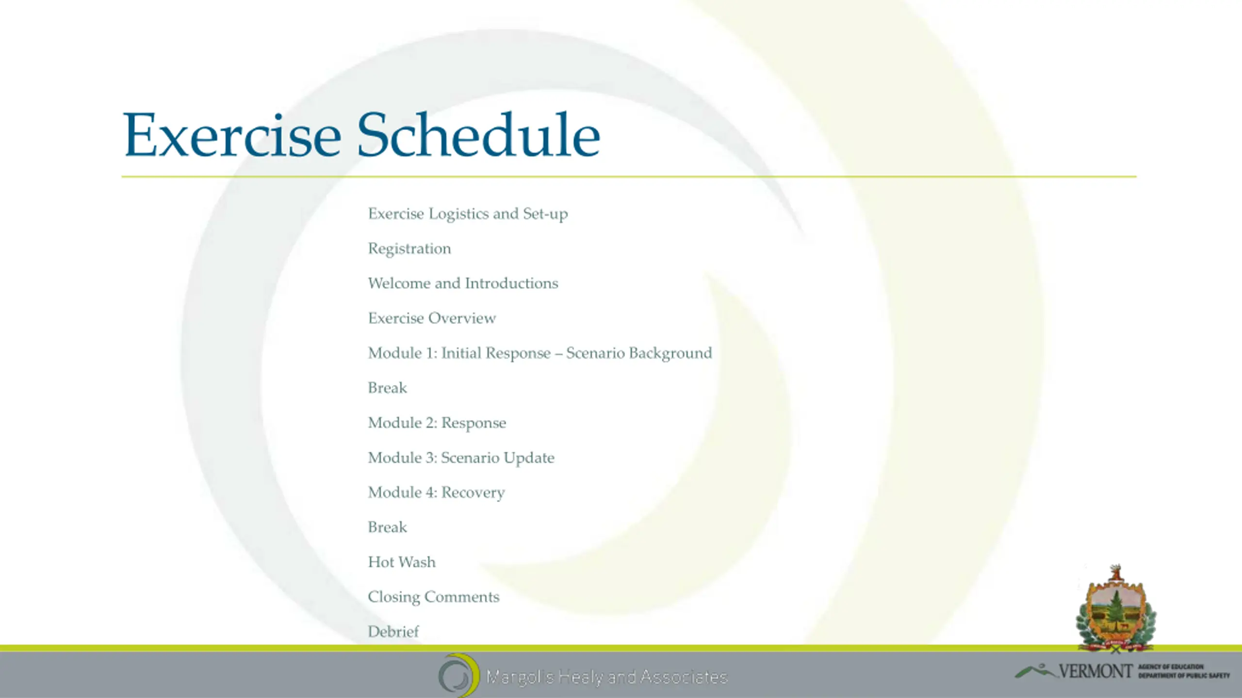 Exercise Schedule Exercise Logistics and Set-up Registration Welcome and Introductions Exercise Overview Module 1: Initial Response Scenario Background Break Module 2: Response Module 3: Scenario Update Module 4: Recovery Break Hot Wash Closing Comments Debrief