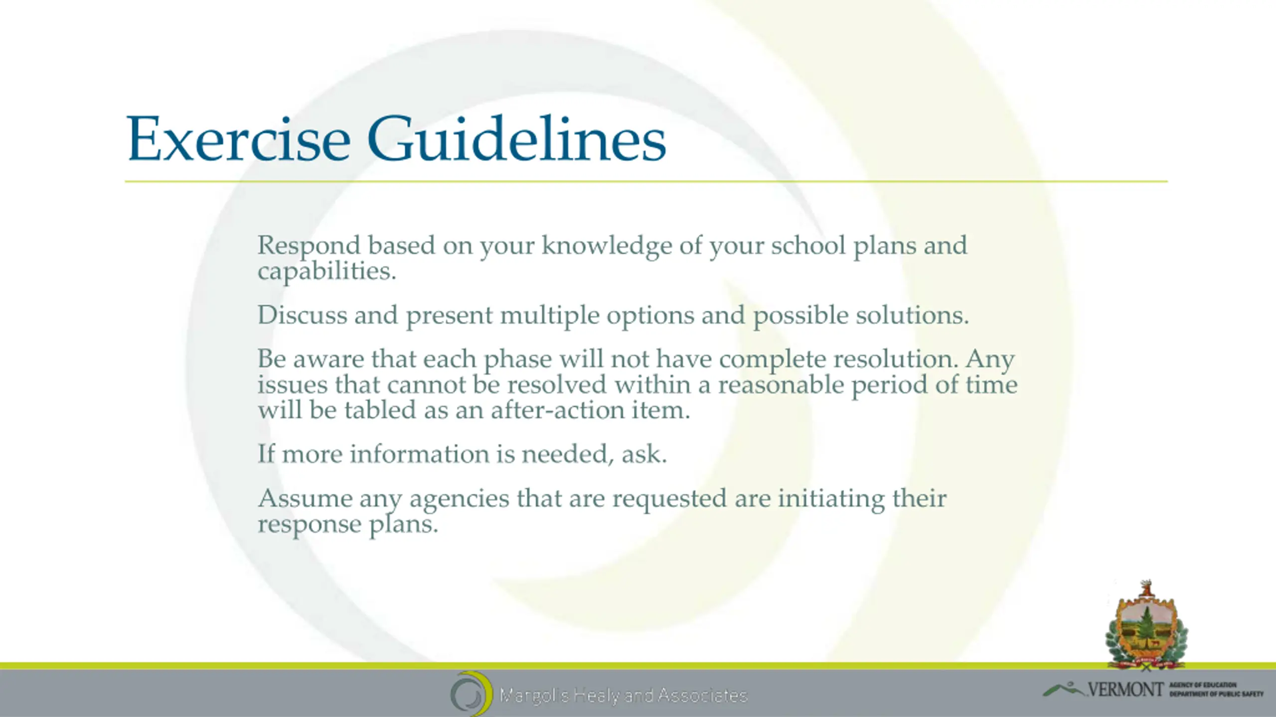Exercise Guidelines Respond based on your knowledge of your school plans and capabilities. Discuss and present multiple options and possible solutions. Be aware that each phase will not have complete resolution. Any issues that cannot be resolved within a reasonable period of time will be tabled as an after-action item. If more information is needed, ask. Assume any agencies that are requested are initiating their response plans.