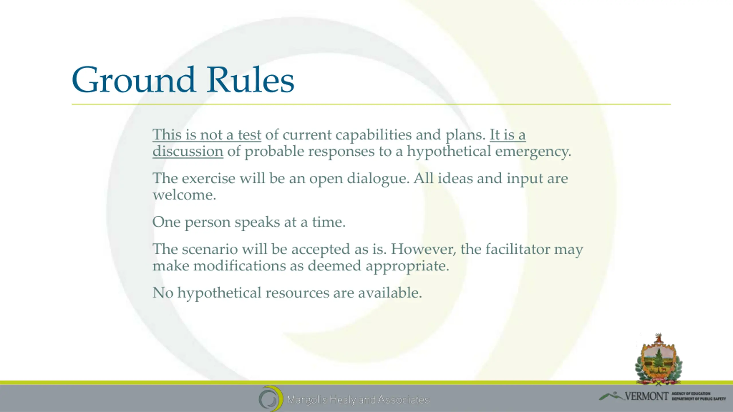 Ground Rules This is not a test of current capabilities and plans. It is a discussion of probable responses to a hypothetical emergency. The exercise will be an open dialogue. All ideas and input are welcome. One person speaks at a time. The scenario will be accepted as is. However, the facilitator may make modifications as deemed appropriate. No hypothetical resources are available.