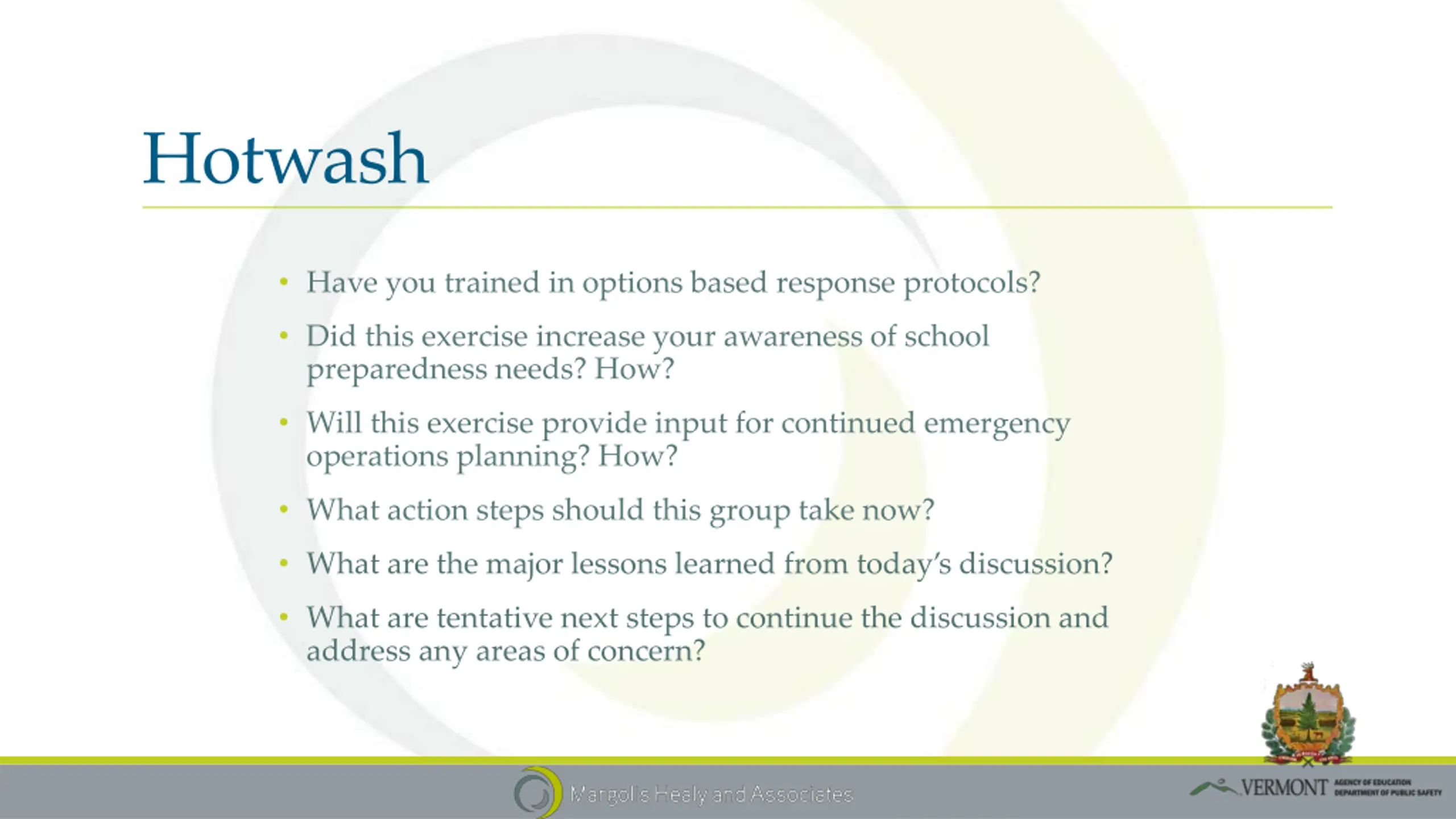 Hotwash Have you trained in options based response protocols? Did this exercise increase your awareness of school preparedness needs? How? Will this exercise provide input for continued emergency operations planning? How? What action steps should this group take now? What are the major lessons learned from today s discussion? What are tentative next steps to continue the discussion and address any areas of concern?