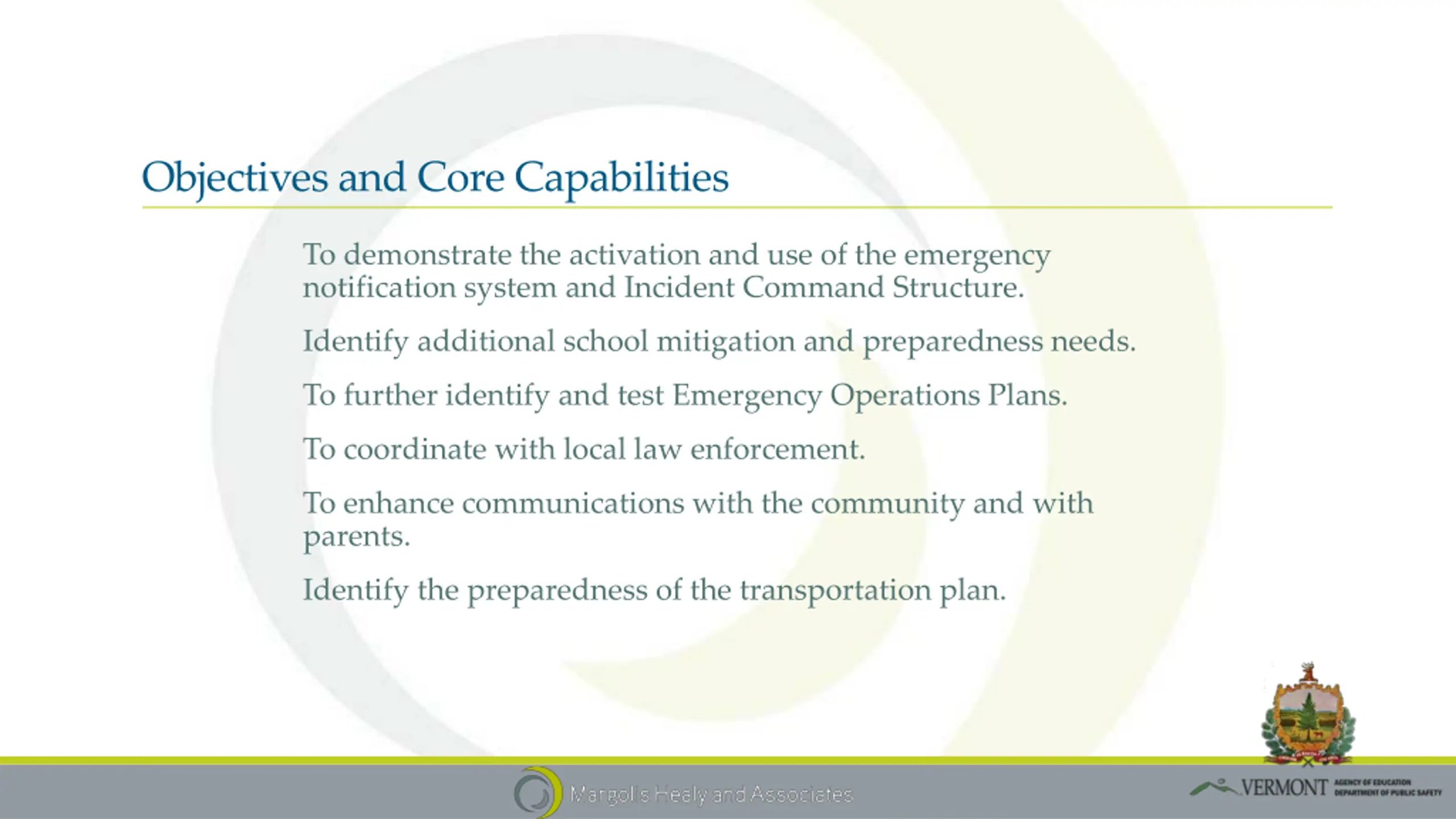 Objectives and Core Capabilities To demonstrate the activation and use of the emergency notification system and Incident Command Structure. Identify additional school mitigation and preparedness needs. To further identify and test Emergency Operations Plans. To coordinate with local law enforcement. To enhance communications with the community and with parents. Identify the preparedness of the transportation plan.