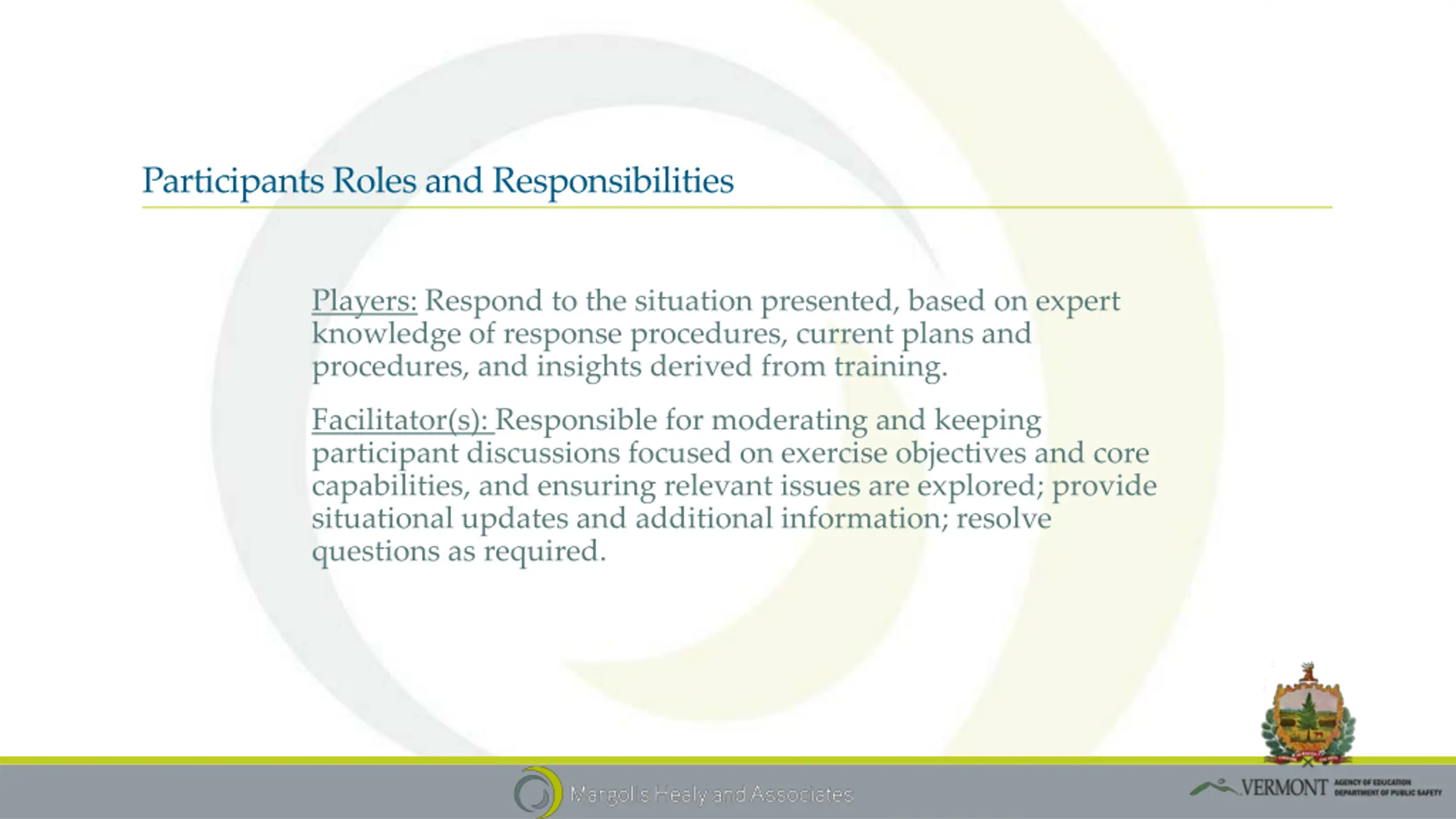 Participants Roles and Responsibilities Players: Respond to the situation presented, based on expert knowledge of response procedures, current plans and procedures, and insights derived from training. Facilitator(s): Responsible for moderating and keeping participant discussions focused on exercise objectives and core capabilities, and ensuring relevant issues are explored; provide situational updates and additional information; resolve questions as required.