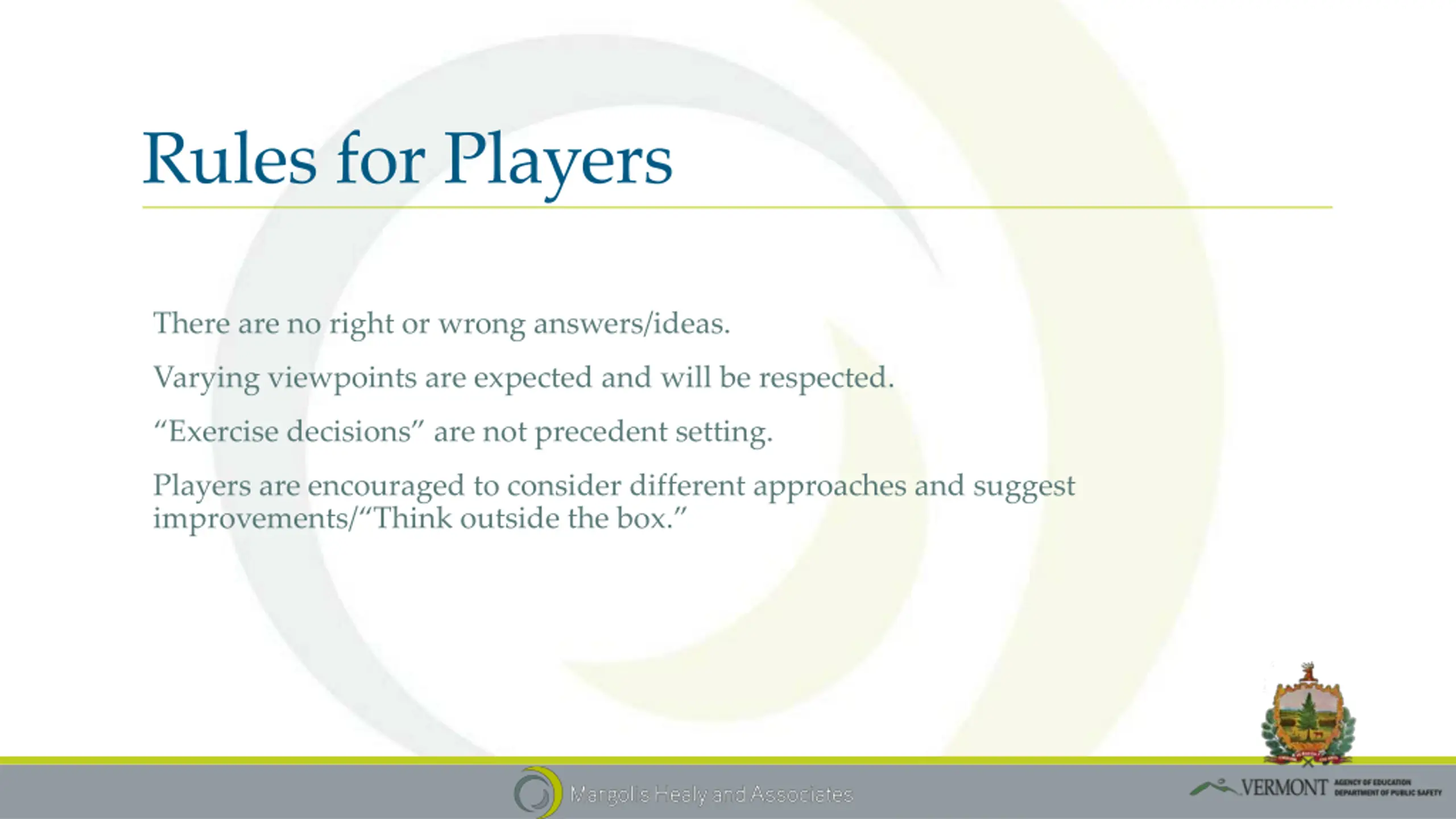 Rules for Players There are no right or wrong answers/ideas. Varying viewpoints are expected and will be respected. Exercise decisions are not precedent setting. Players are encouraged to consider different approaches and suggest improvements/ Think outside the box.