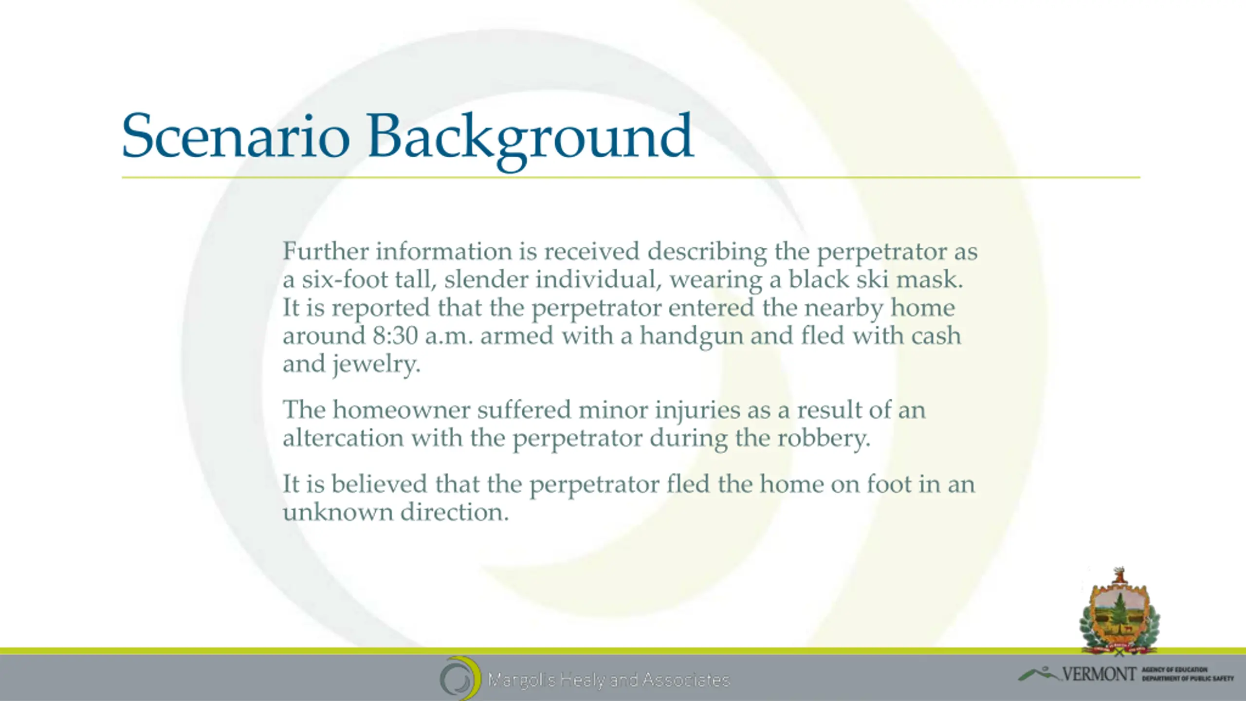 Scenario Background Further information is received describing the perpetrator as a six-foot tall, slender individual, wearing a black ski mask. It is reported that the perpetrator entered the nearby home around 8:30 a.m. armed with a handgun and fled with cash and jewelry. The homeowner suffered minor injuries as a result of an altercation with the perpetrator during the robbery. It is believed that the perpetrator fled the home on foot in an unknown direction.