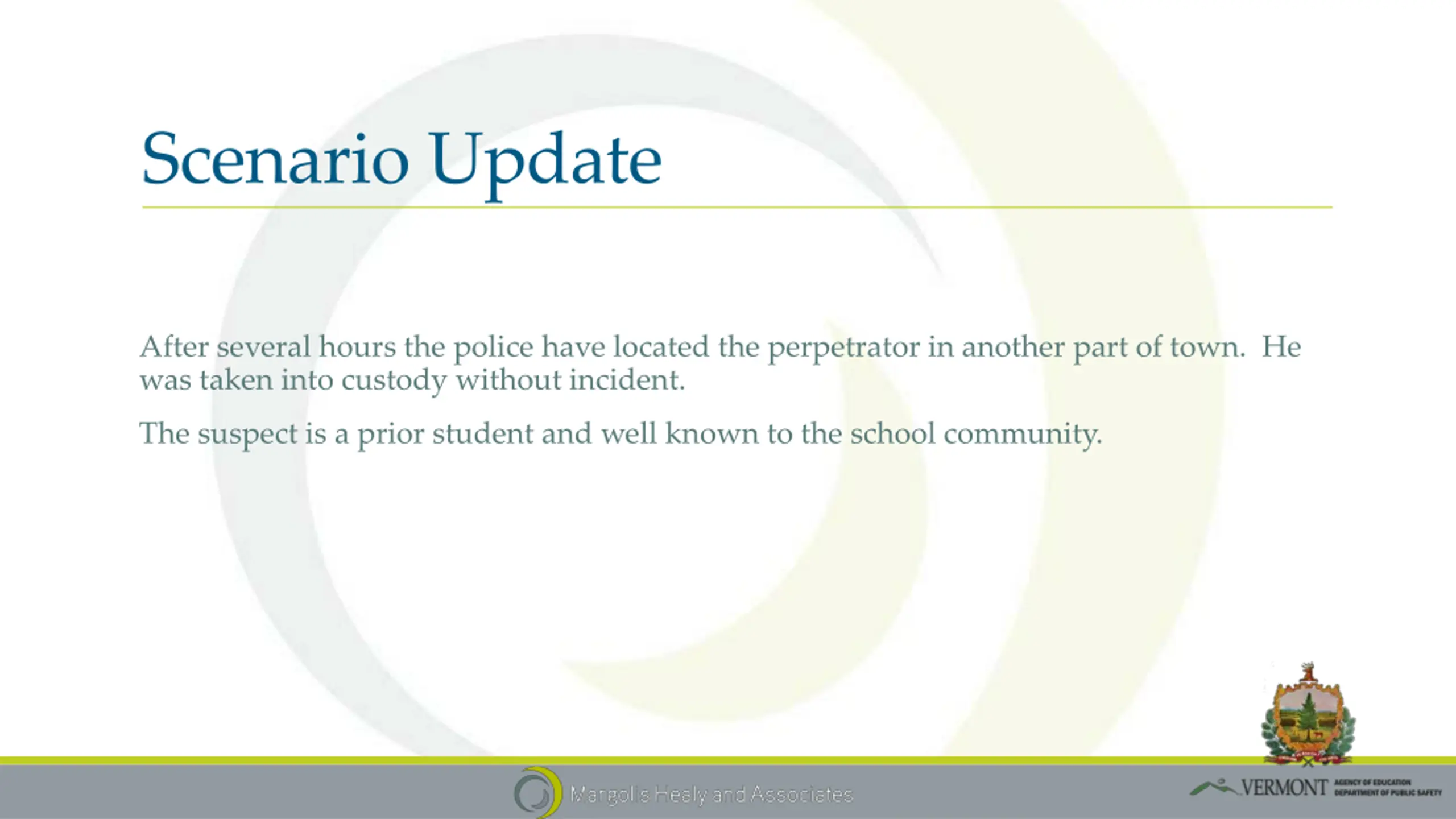 Scenario Update After several hours the police have located the perpetrator in another part of town. He was taken into custody without incident. The suspect is a prior student and well known to the school community.