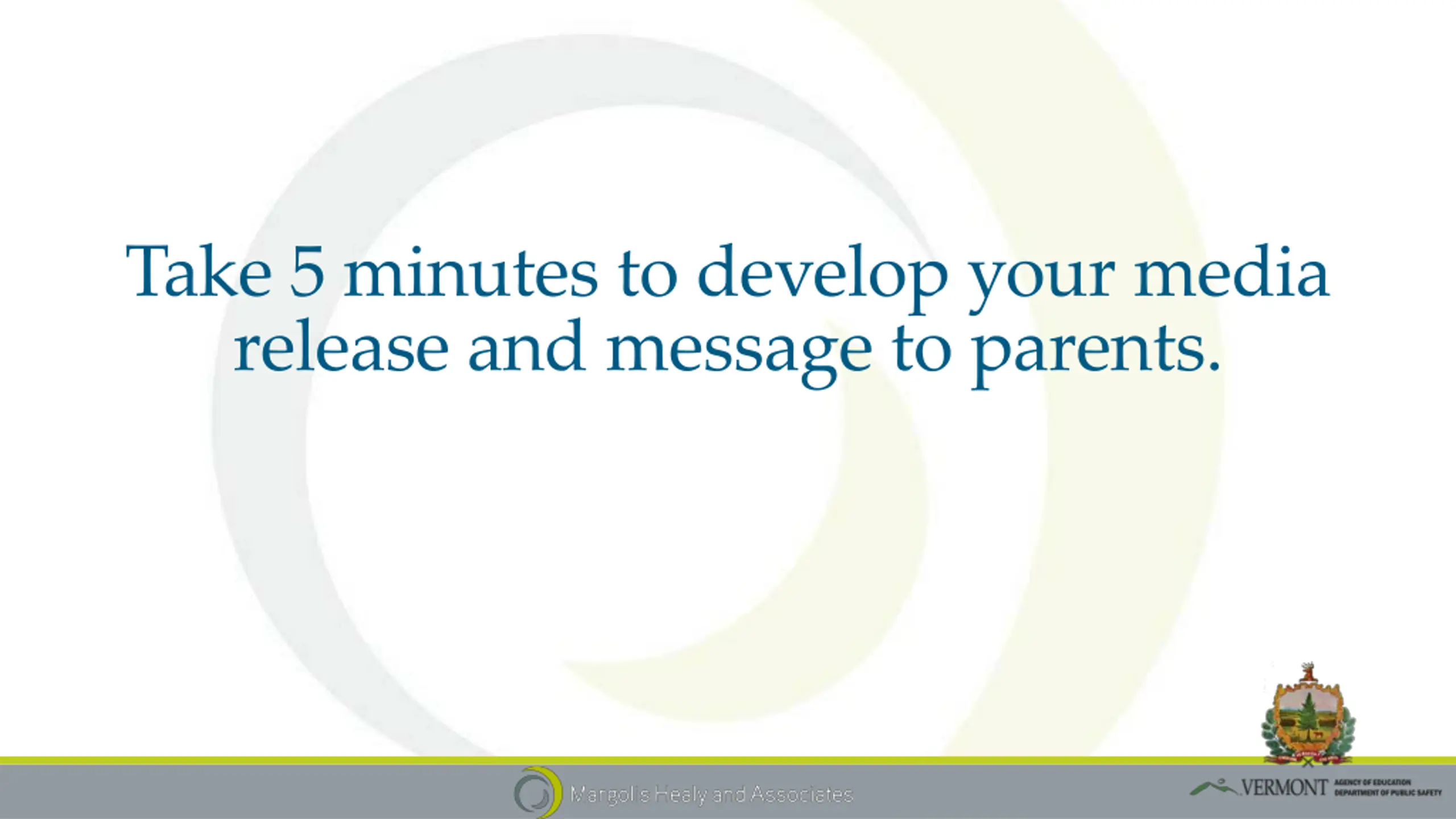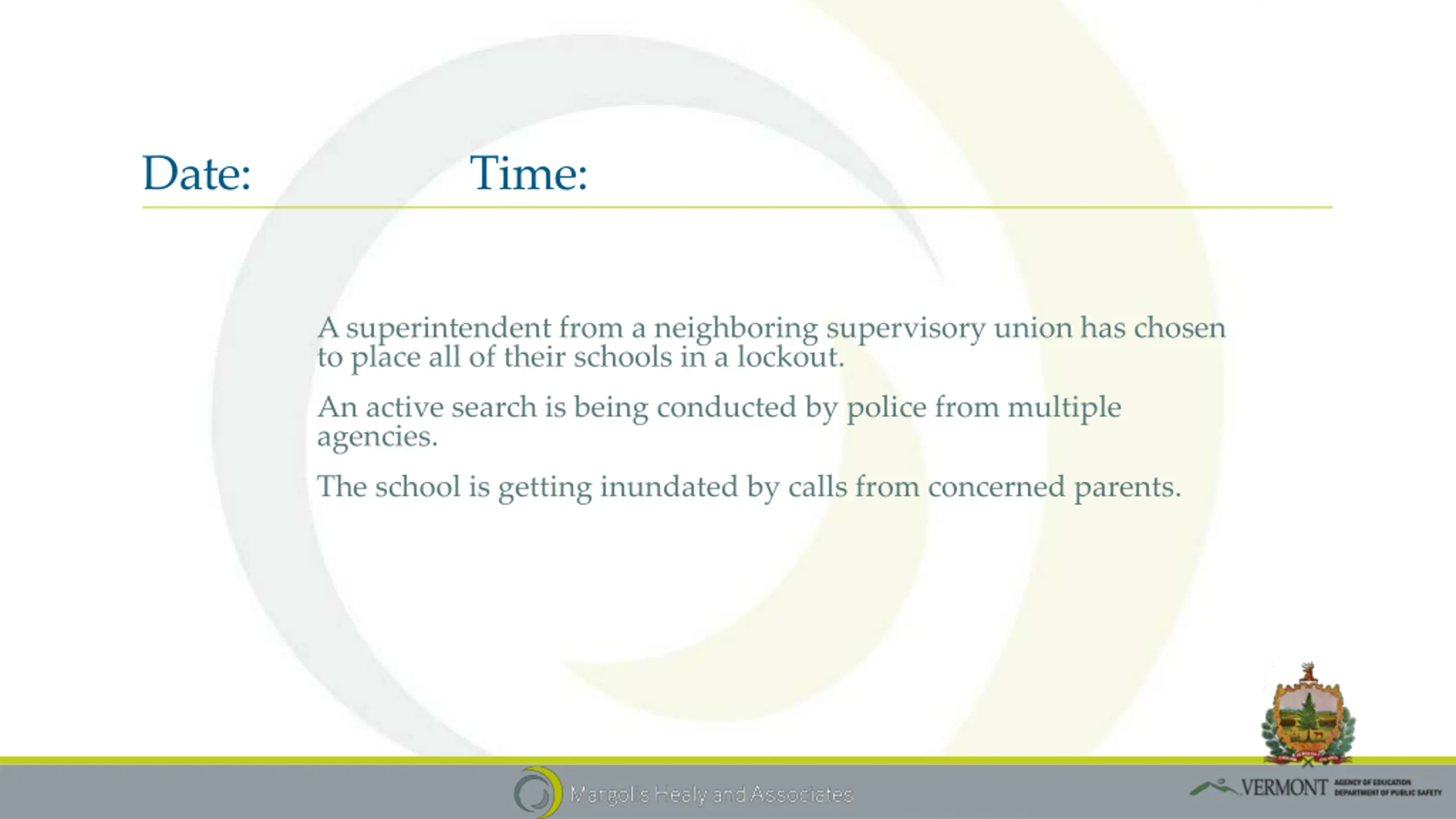 Date: Time: A superintendent from a neighboring supervisory union has chosen to place all of their schools in a lockout. An active search is being conducted by police from multiple agencies. The school is getting inundated by calls from concerned parents.