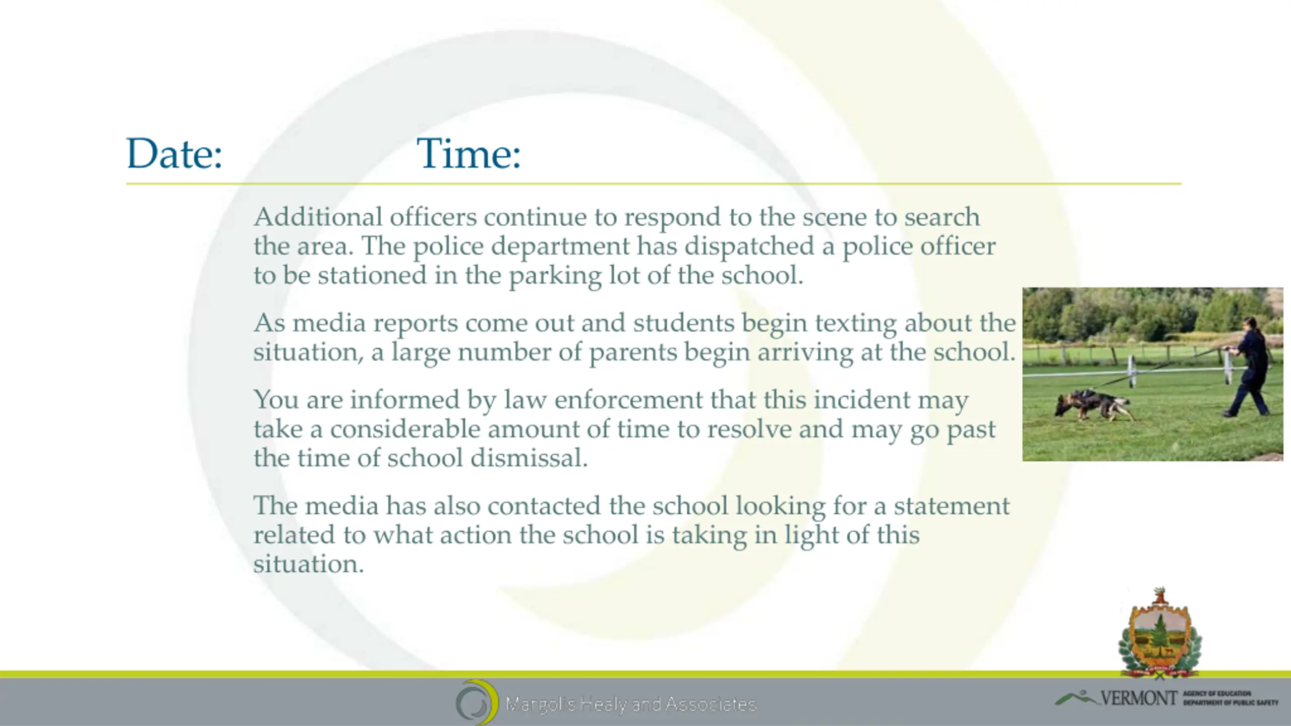 Date: Time: Additional officers continue to respond to the scene to search the area. The police department has dispatched a police officer to be stationed in the parking lot of the school. As media reports come out and students begin texting about the situation, a large number of parents begin arriving at the school. You are informed by law enforcement that this incident may take a considerable amount of time to resolve and may go past the time of school dismissal. The media has also contacted the school looking for a statement related to what action the school is taking in light of this situation.