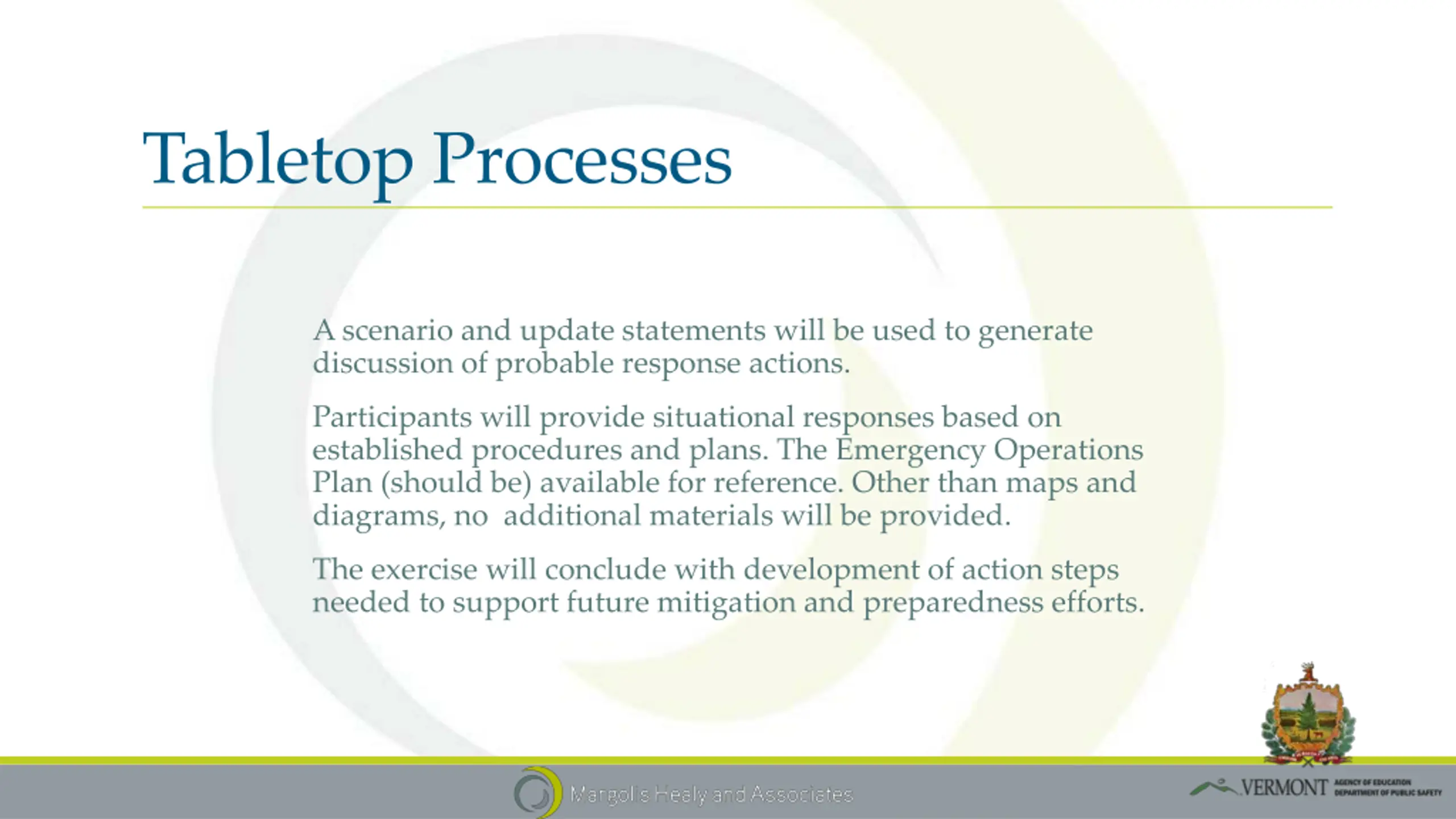 Tabletop Processes A scenario and update statements will be used to generate discussion of probable response actions. Participants will provide situational responses based on established procedures and plans. The Emergency Operations Plan (should be) available for reference. Other than maps and diagrams, no additional materials will be provided. The exercise will conclude with development of action steps needed to support future mitigation and preparedness efforts.