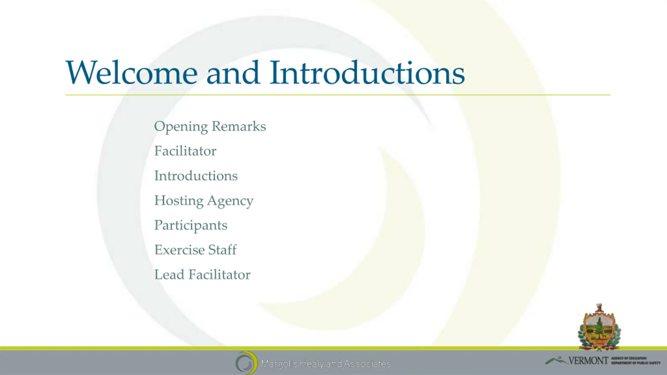 Welcome and Introductions Opening Remarks Facilitator Introductions Hosting Agency Participants Exercise Staff Lead Facilitator