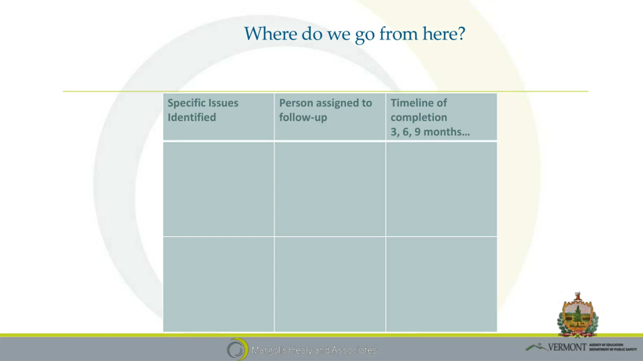 Where do we go from here? Specific Issues Identified Person assigned to follow-up Timeline of completion 3, 6, 9 months
