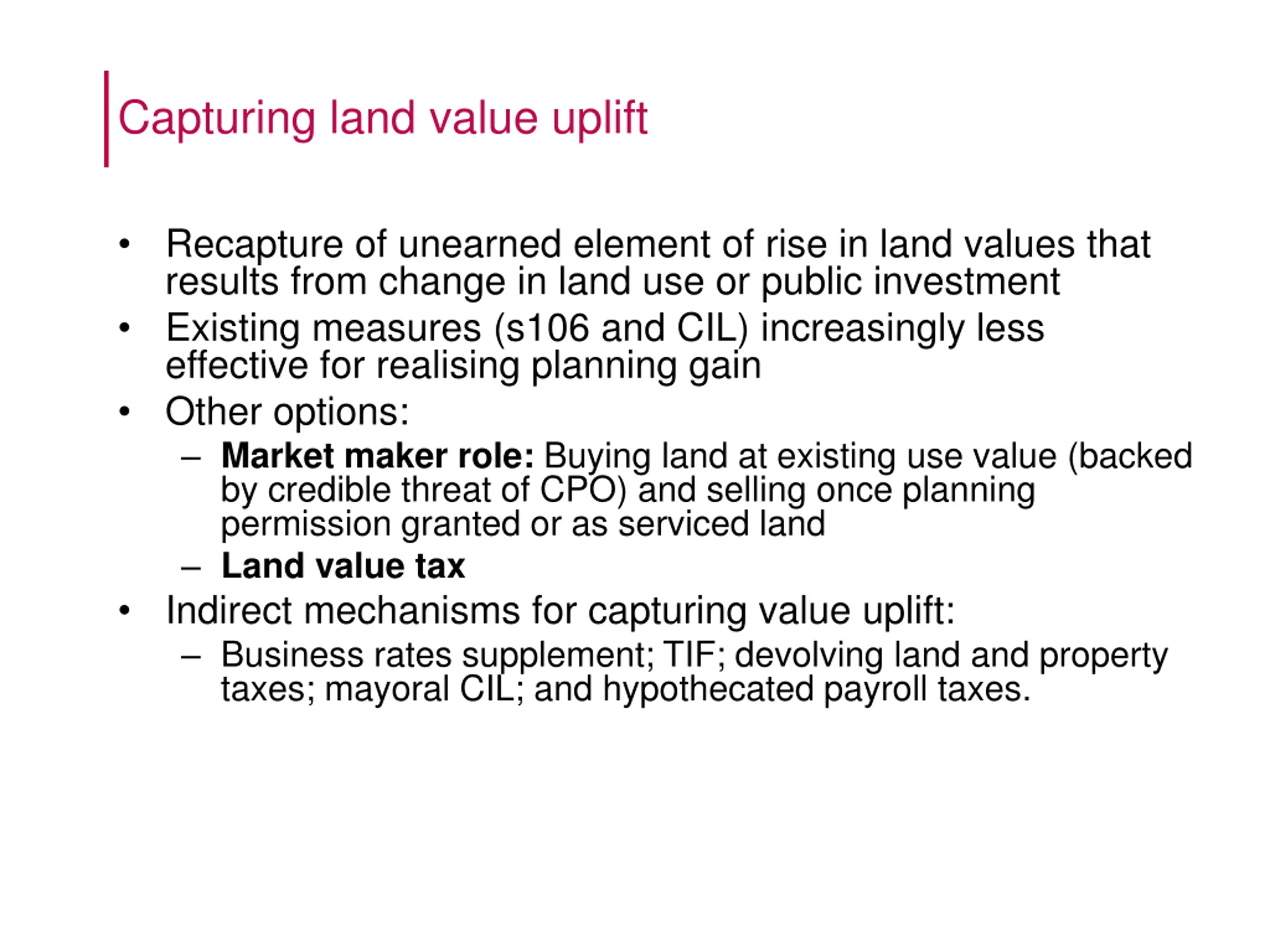 Capturing land value uplift Recapture of unearned element of rise in land values that results from change in land use or public investment Existing measures (s106 and CIL) increasingly less effective for realising planning gain Other options: Market maker role: Buying land at existing use value (backed by credible threat of CPO) and selling once planning permission granted or as serviced land Land value tax Indirect mechanisms for capturing value uplift: Business rates supplement; TIF; devolving land and property taxes; mayoral CIL; and hypothecated payroll taxes.