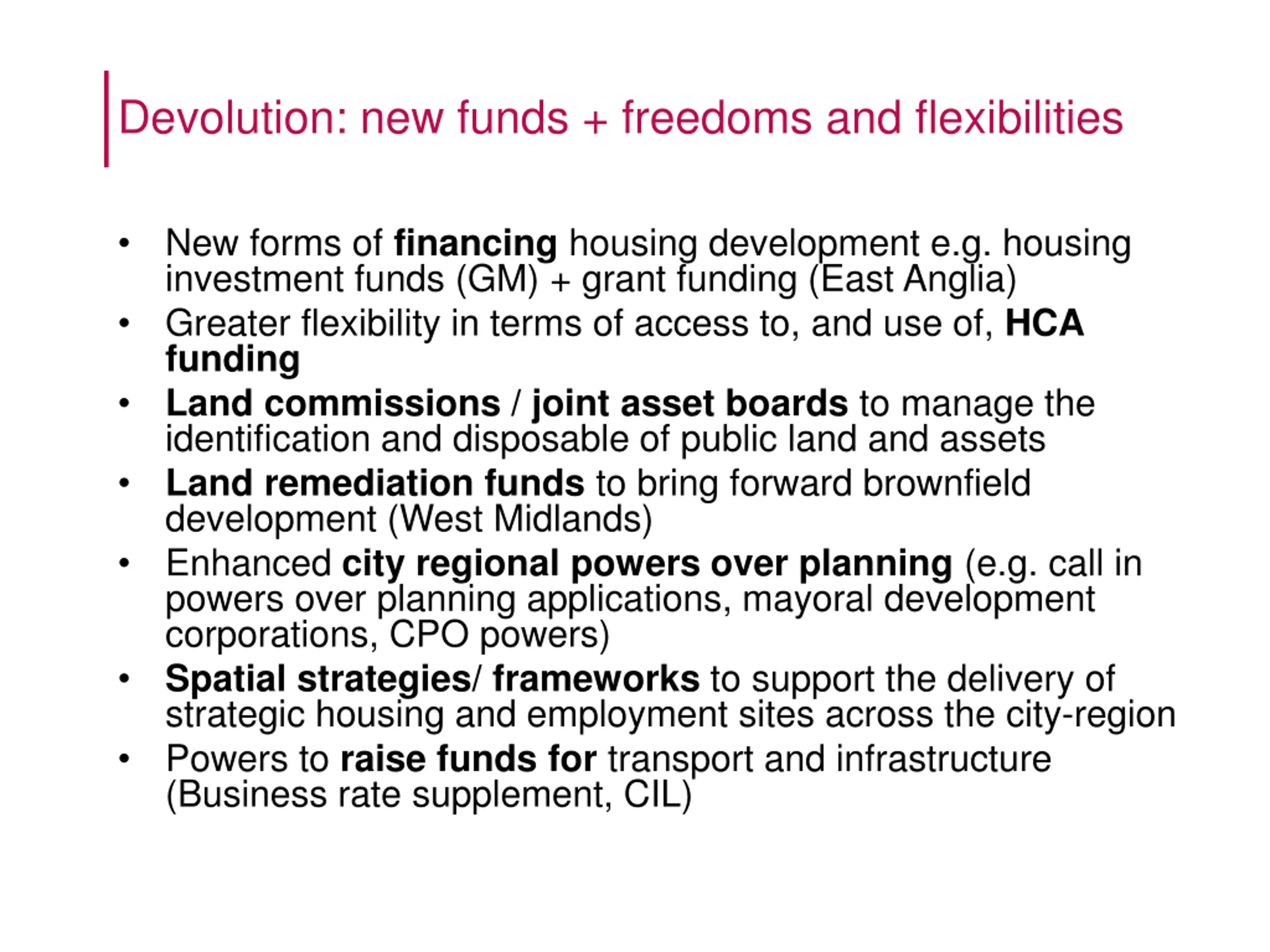 Devolution: new funds + freedoms and flexibilities New forms of financing housing development e.g. housing investment funds (GM) + grant funding (East Anglia) Greater flexibility in terms of access to, and use of, HCA funding Land commissions / joint asset boards to manage the identification and disposable of public land and assets Land remediation funds to bring forward brownfield development (West Midlands) Enhanced city regional powers over planning (e.g. call in powers over planning applications, mayoral development corporations, CPO powers) Spatial strategies/ frameworks to support the delivery of strategic housing and employment sites across the city-region Powers to raise funds for transport and infrastructure (Business rate supplement, CIL)